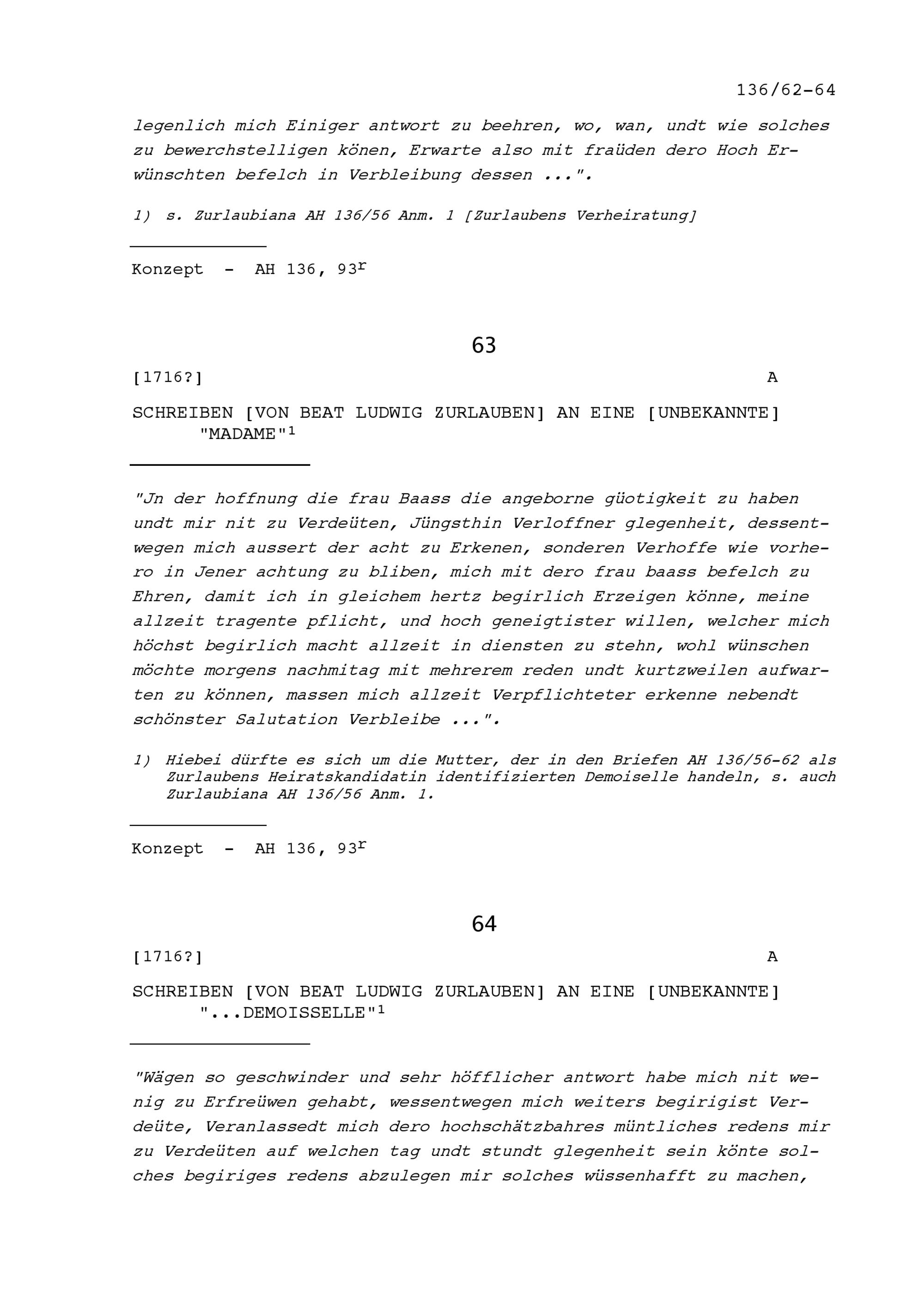 Schreiben von Beat Ludwig Zurlauben an eine Dame