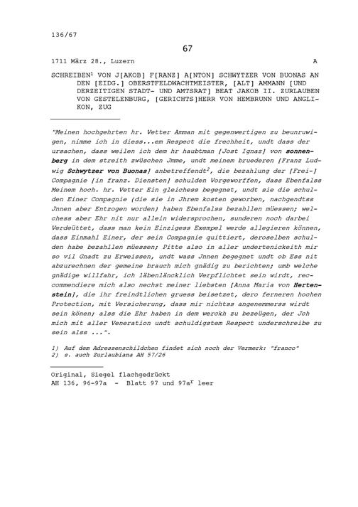 Schreiben von Jakob Franz Anton Schwytzer von Buonas an Beat Jakob II. Zurlauben, eidgenössischer Oberstfeldwachtmeister, Altammann und Stadt- und Amtrat, Zug