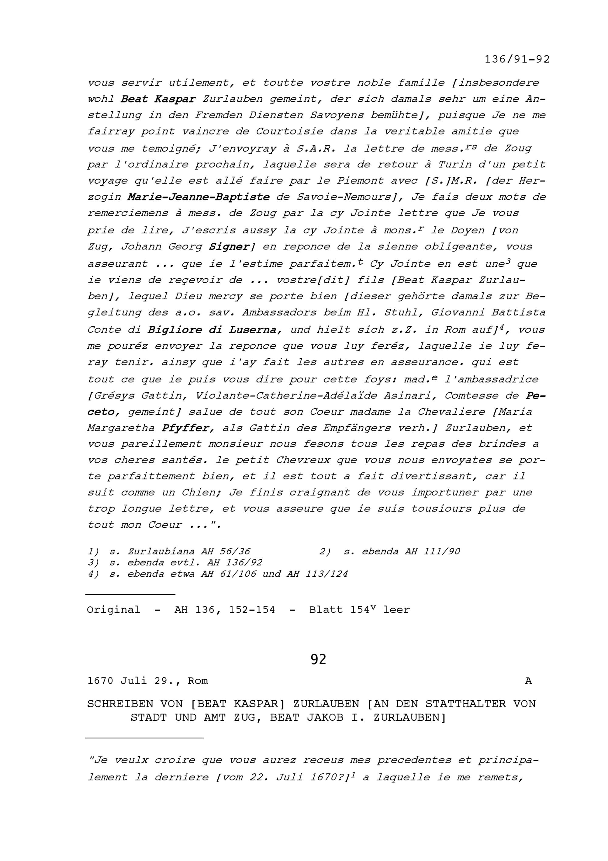 Schreiben von Beat Kaspar Zurlauben an Beat Jakob I. Zurlauben, Statthalter von Stadt...