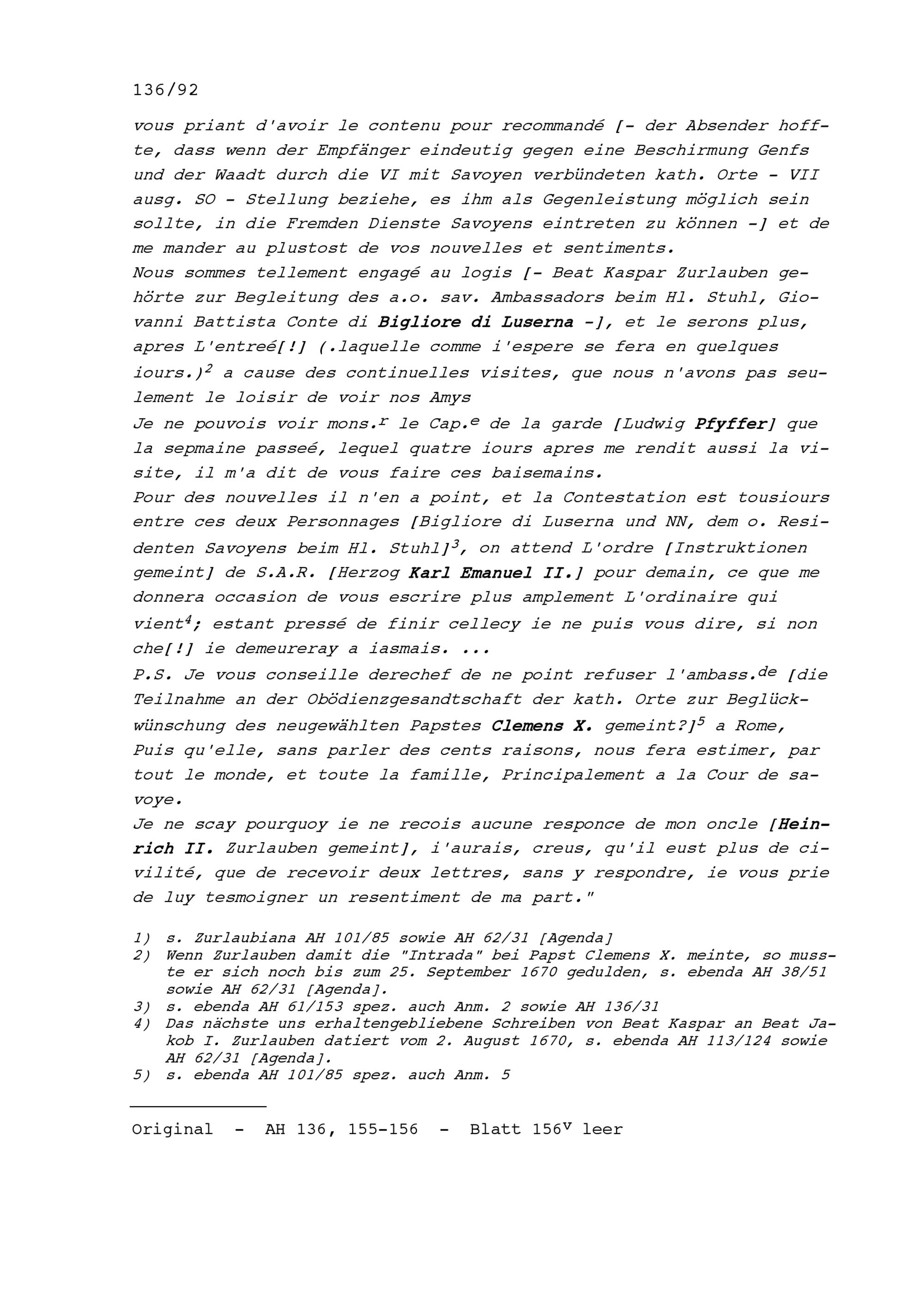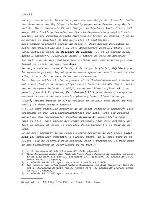 Schreiben von Beat Kaspar Zurlauben an Beat Jakob I. Zurlauben, Statthalter von Stadt...