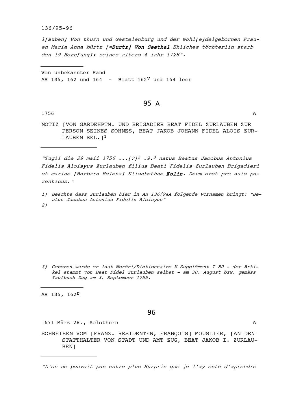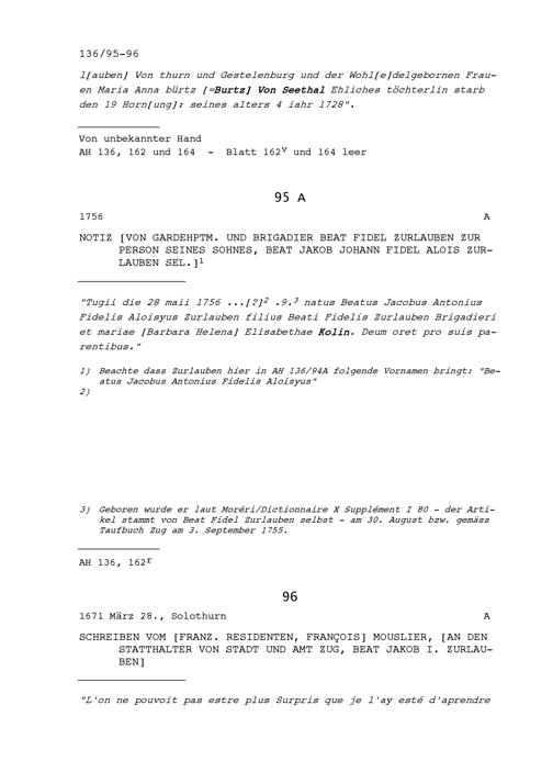 Notiz von Beat Fidel Zurlauben, Gardehauptmann und Brigadier, zu Beat Jakob Johann...