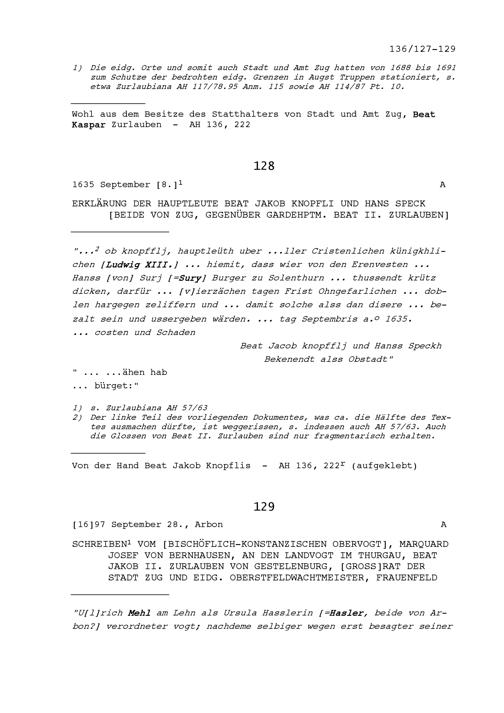 Erklärung von Beat Jakob Knopfli, Hauptmann, und von Hans Speck, Hauptmann, beide von Zug, gegenüber Beat II. Zurlauben, Gardehauptmann