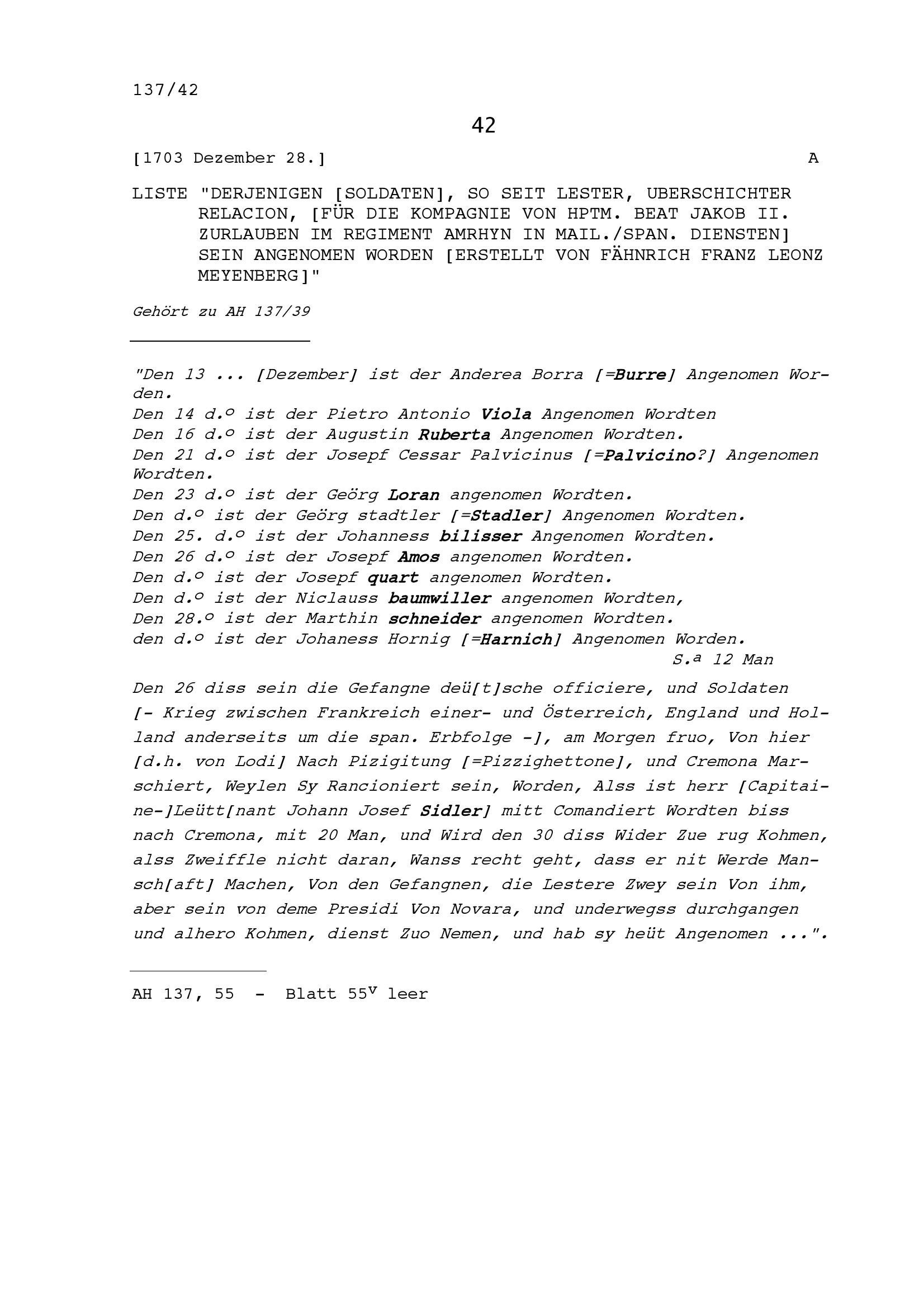 Soldaten, die neu für die Kompanie von Beat Jakob II. Zurlauben, Hauptmann im Regiment Amrhyn in mailändisch-spanischen Diensten, angenommen wurden, erstellt von Franz Leonz Meyenberg, Fähnrich