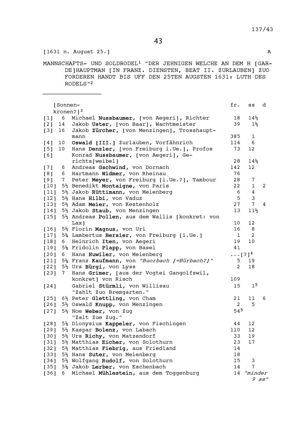 Mannschafts- und Soldrodel jener, die finanzielle Ansprüche an Beat II. Zurlauben, Gardehauptmann in französischen Diensten, haben, bis 25. August 1631