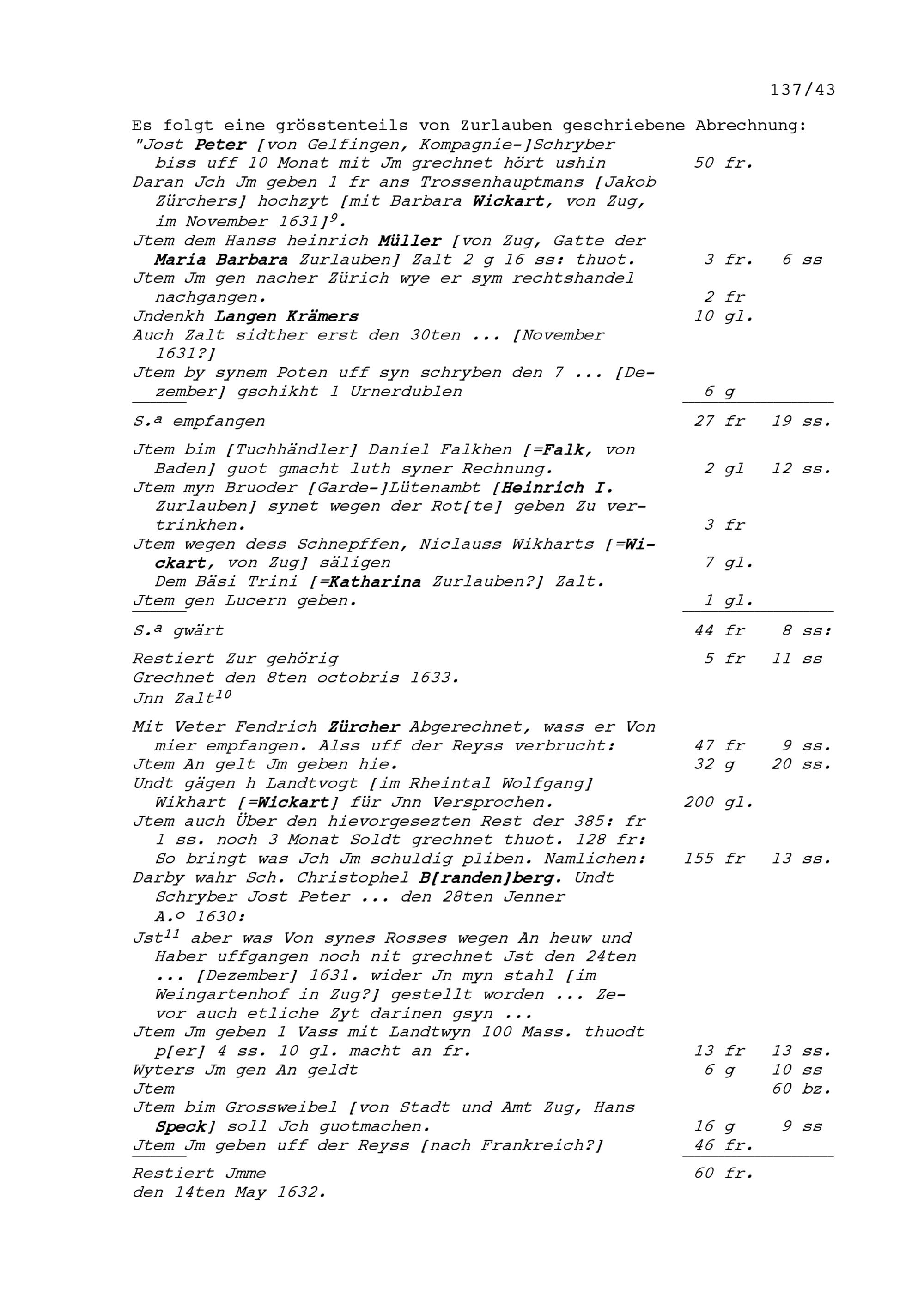 Mannschafts- und Soldrodel jener, die finanzielle Ansprüche an Beat II. Zurlauben, Gardehauptmann in französischen Diensten, haben, bis 25. August 1631