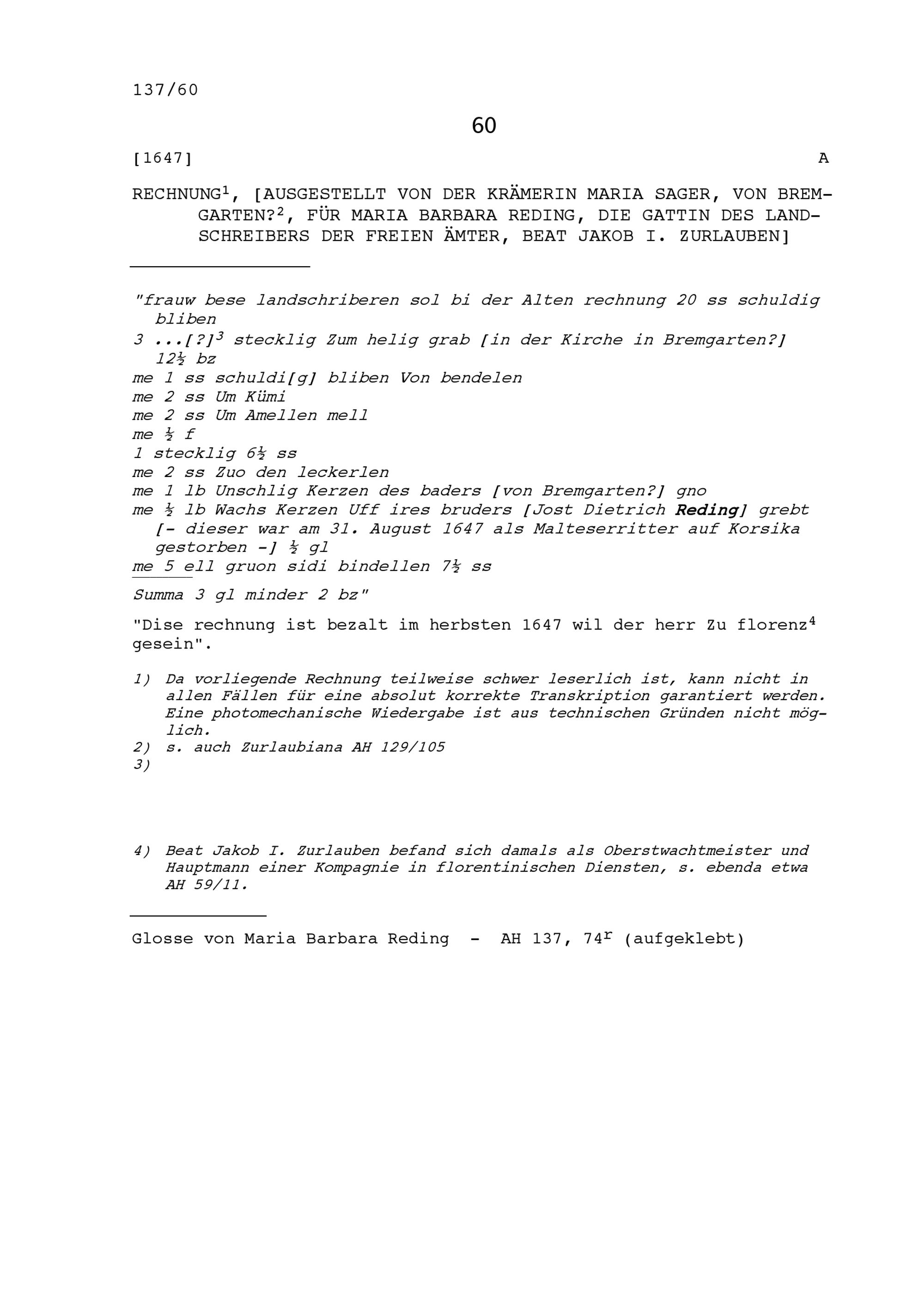 Rechnung für Maria Barbara Reding, Gattin von Beat Jakob I. Zurlauben, Landschreiber der Freien Ämter, ausgestellt von Maria Sager, Krämerin, von Bremgarten