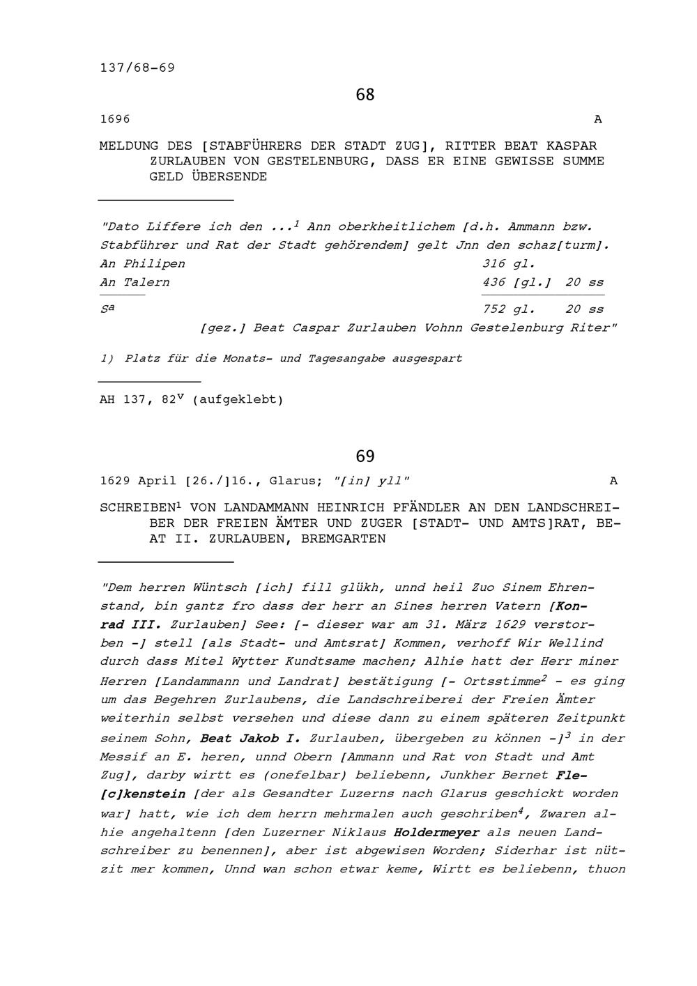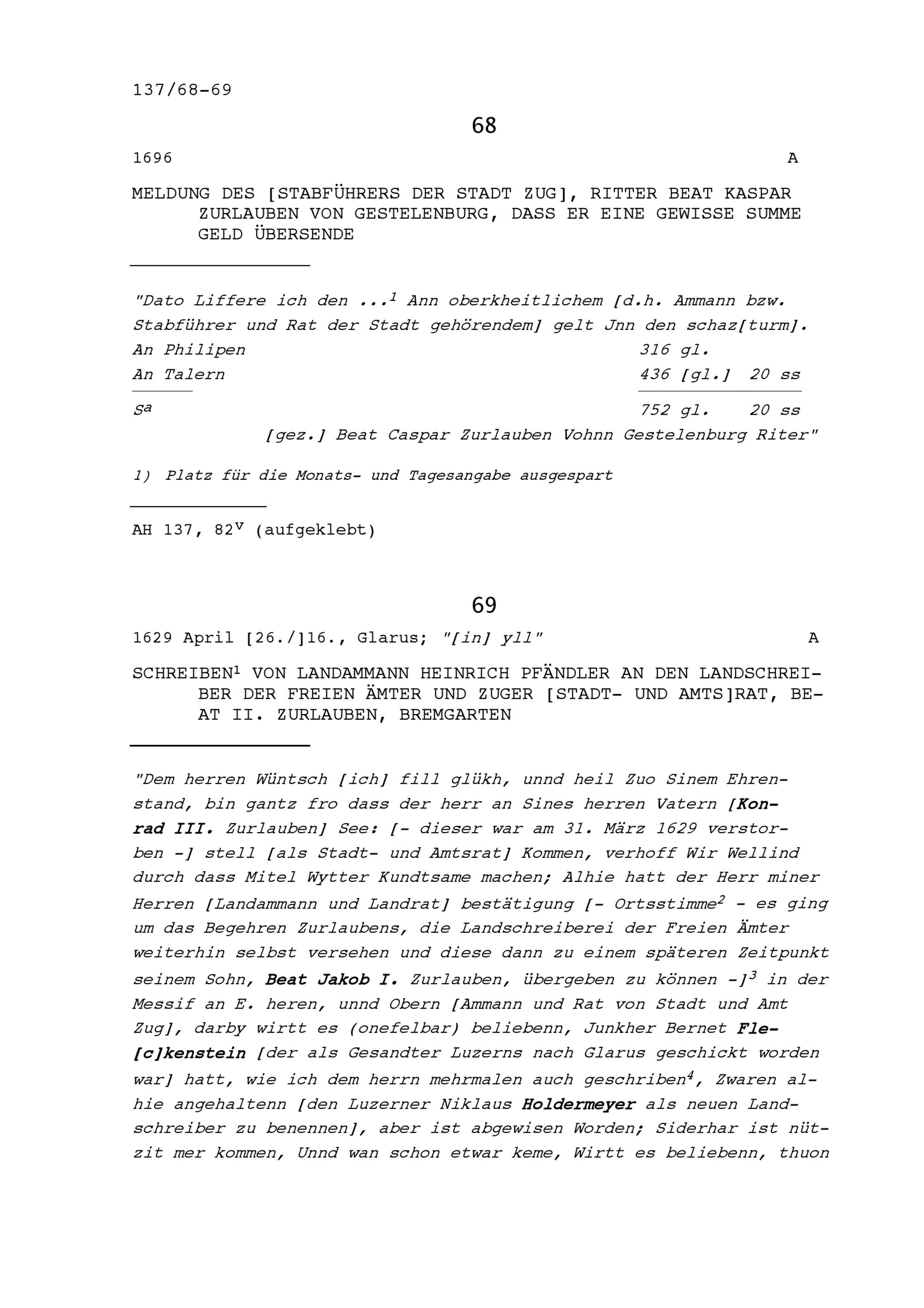 Meldung von Zug Beat Kaspar Zurlauben, Stabführer der Stadt, er werde eine gewisse...