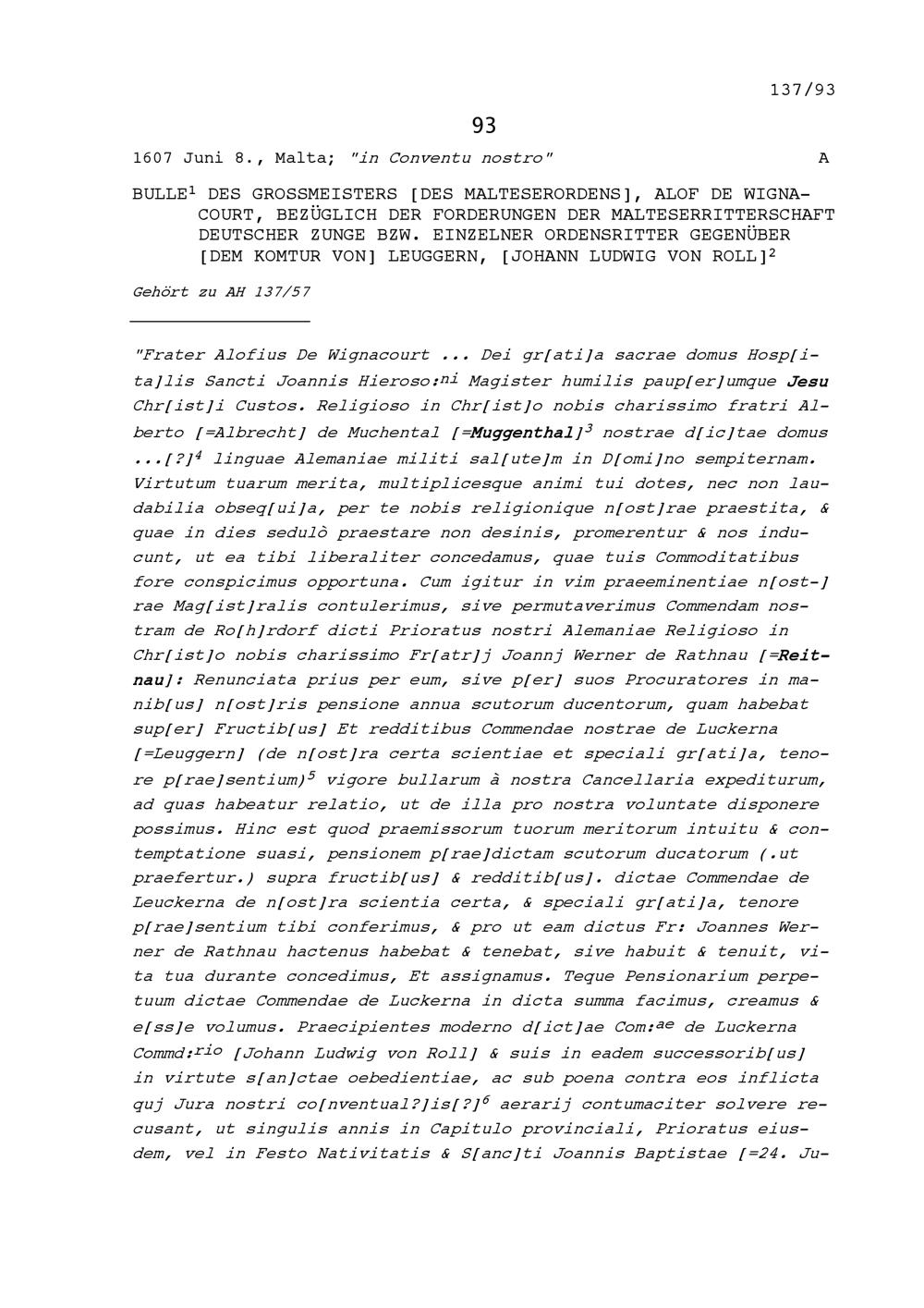 Bulle von Alof von Wignacourt, Grossmeister des Malteserordens, bezüglich der Forderungen der Malteserritterschaft deutscher Zungen beziehungsweise einzelner Ordensritter gegenüber Johann Ludwig von Roll, Komtur von Leuggern