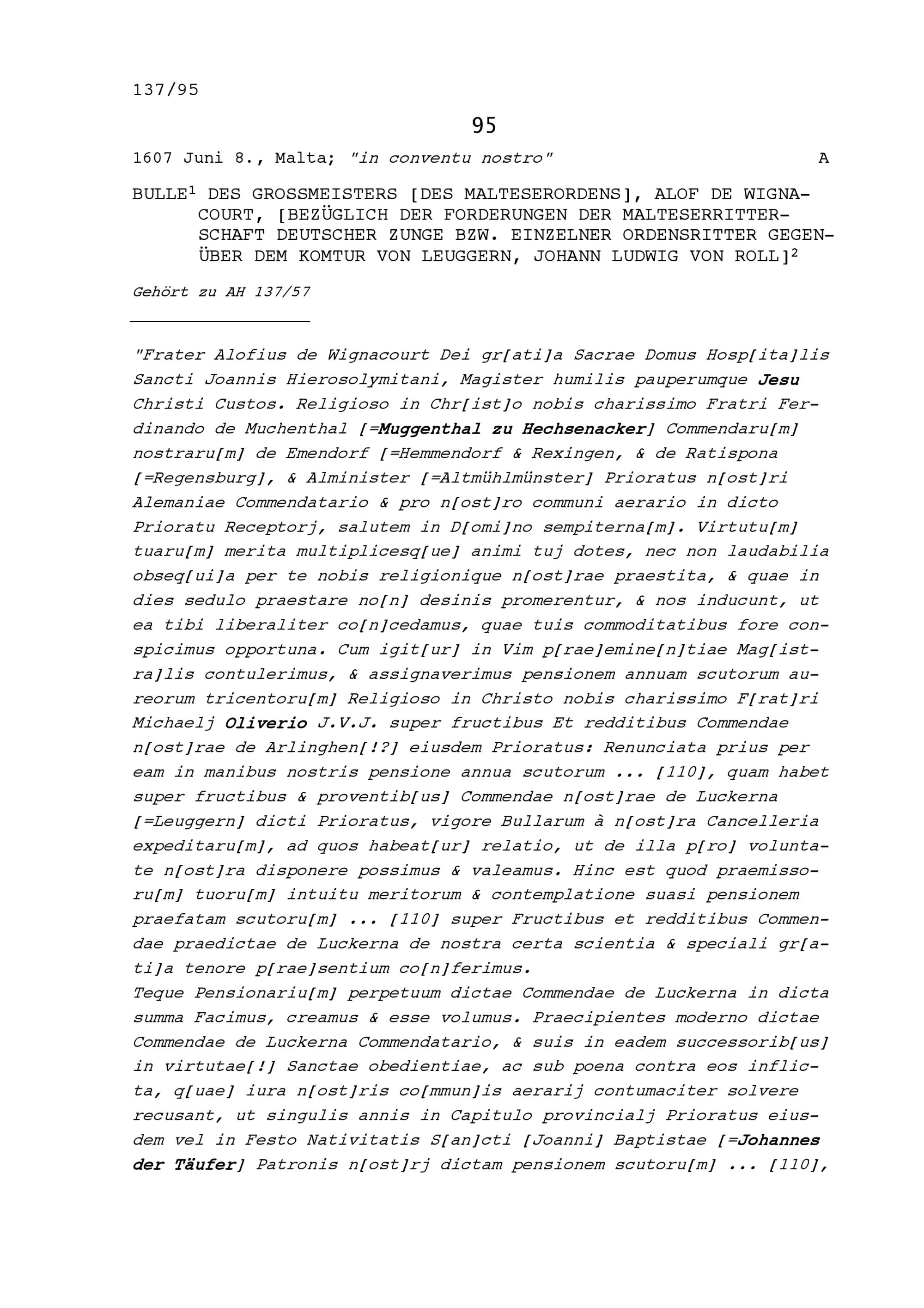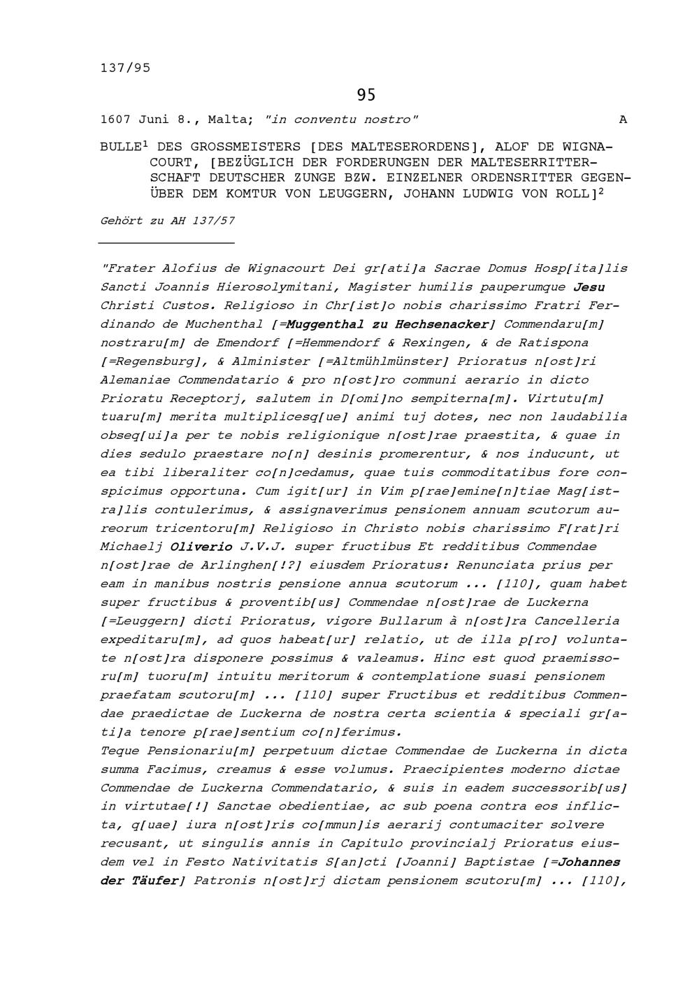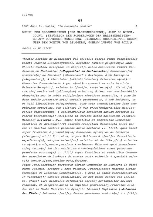 Bulle von Alof von Wignacourt, Grossmeister des Malteserordens, wegen finanzieller Forderungen der Malteserritterschaft deutscher Zungen beziehungsweise einzelner Ordensritter gegenüber Johann Ludwig von Roll, Komtur von Leuggern