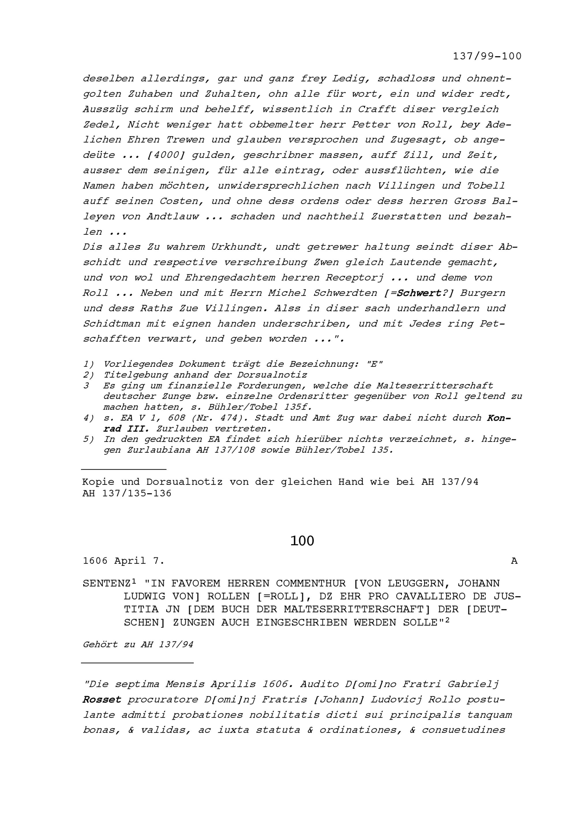 Urteil in Sachen Johann Ludwig von Roll, Komtur von Leuggern,