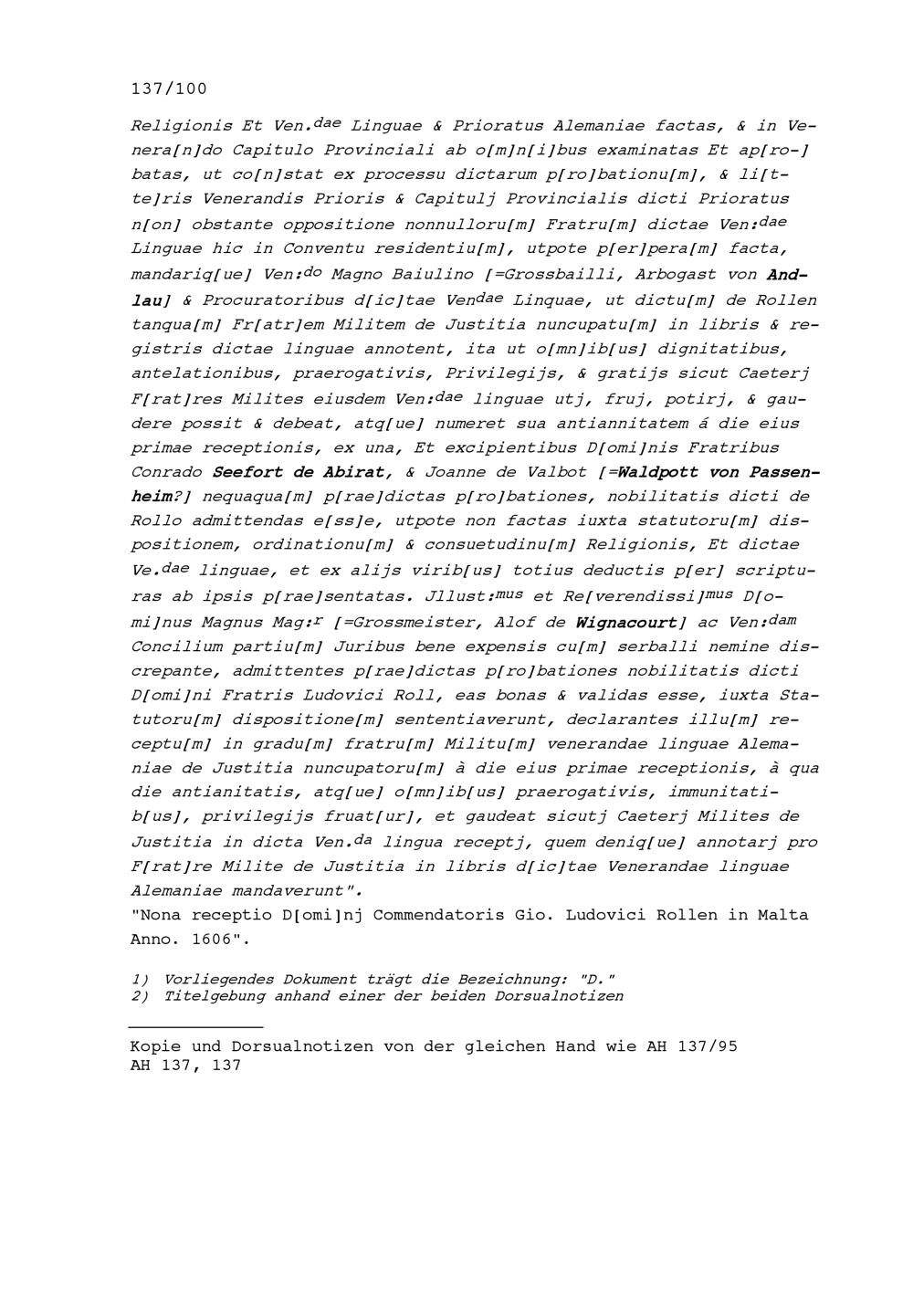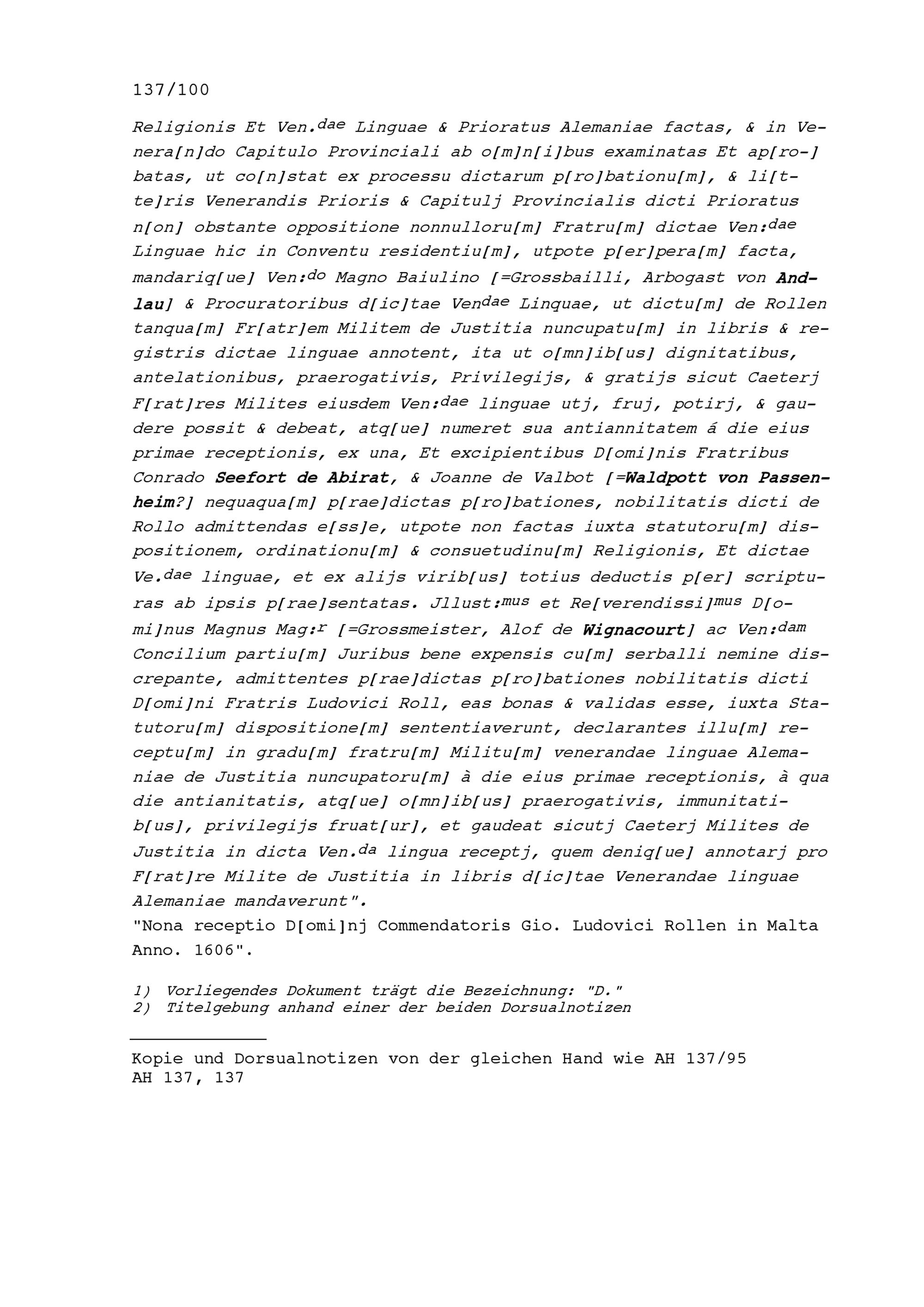 Urteil in Sachen Johann Ludwig von Roll, Komtur von Leuggern,
