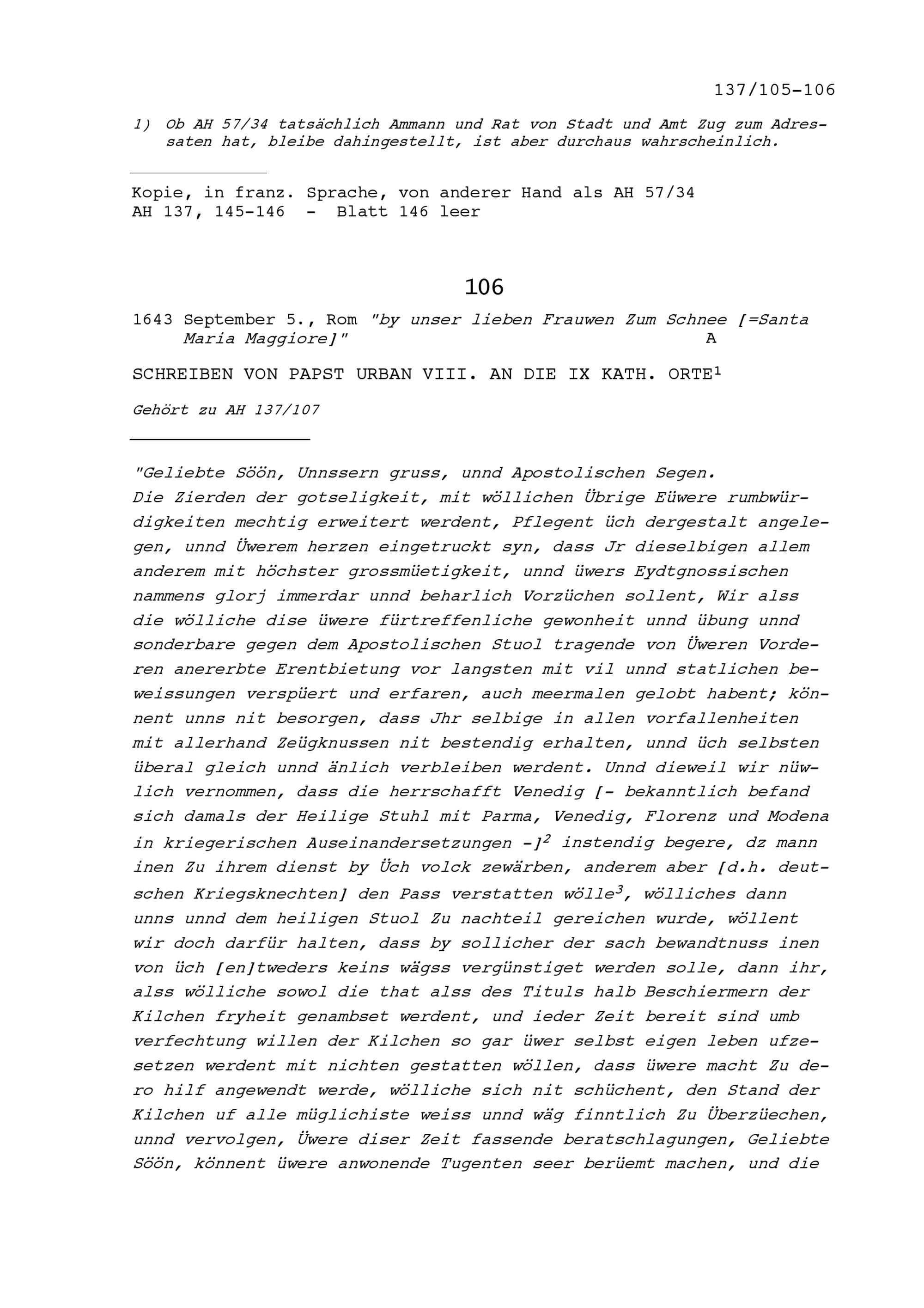 Schreiben von Urban VIII., Papst, an die Neun Katholischen Orte