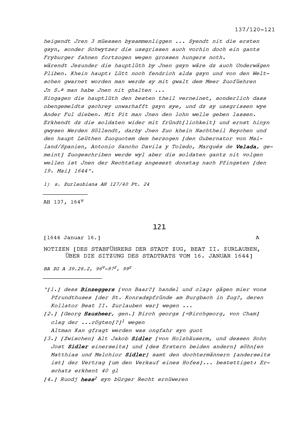 Notiz von Beat II. Zurlauben, Stabführer der Stadt Zug, über die Sitzung des Stadtrats vom 16. Januar 1644