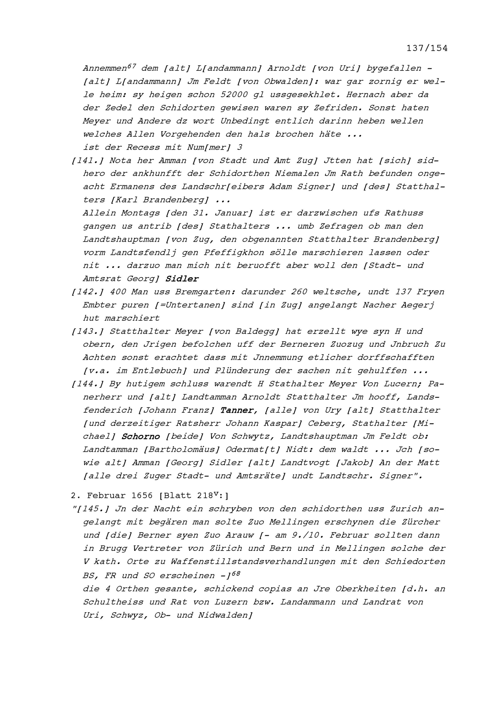 Notizen von Beat II. Zurlauben, Stadt- und Amtrat Zug und Kriegsrat, zum Artherhandel von 1655, zum Villmergerkrieg von 1656 sowie zu den Friedensverhandlungen