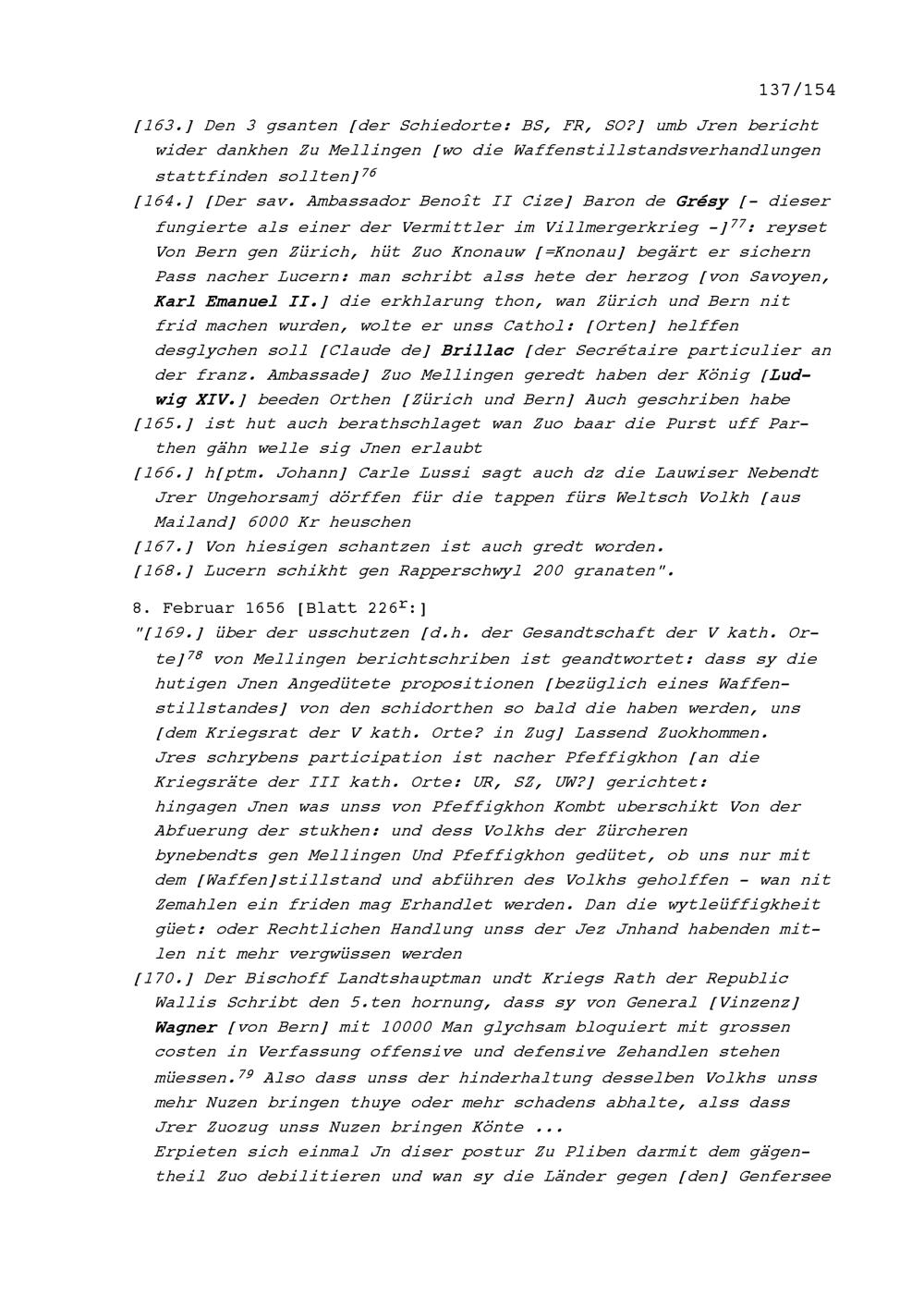 Notizen von Beat II. Zurlauben, Stadt- und Amtrat Zug und Kriegsrat, zum Artherhandel von 1655, zum Villmergerkrieg von 1656 sowie zu den Friedensverhandlungen