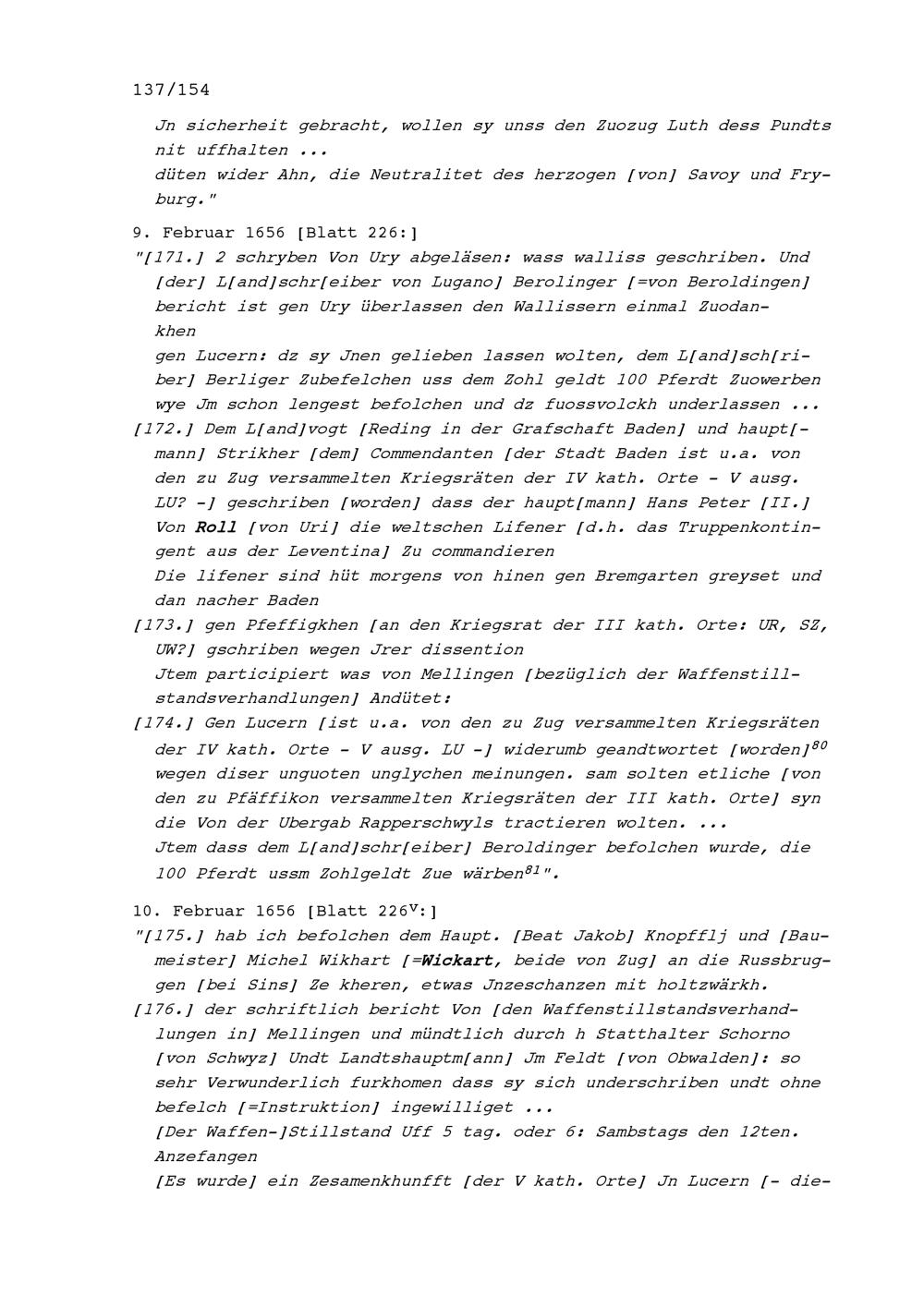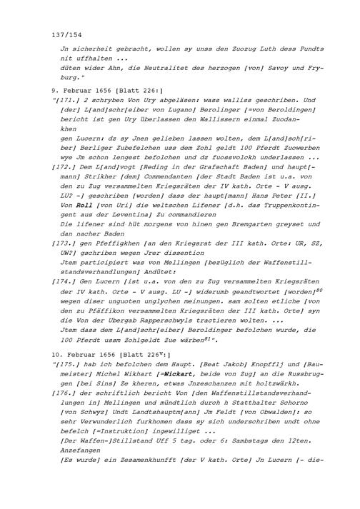 Notizen von Beat II. Zurlauben, Stadt- und Amtrat Zug und Kriegsrat, zum Artherhandel von 1655, zum Villmergerkrieg von 1656 sowie zu den Friedensverhandlungen