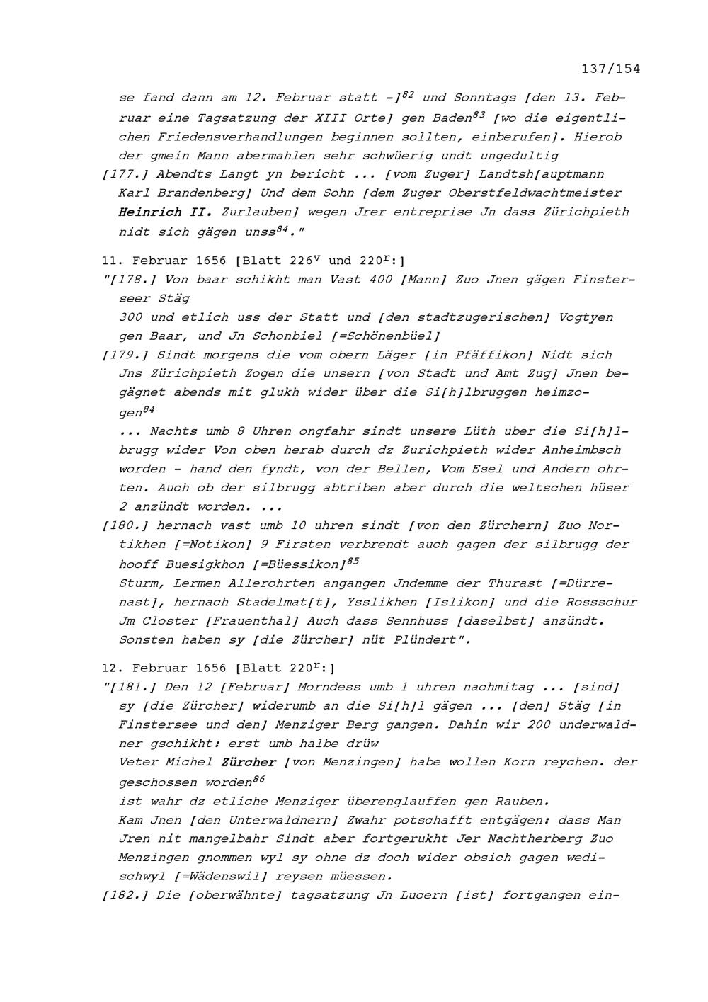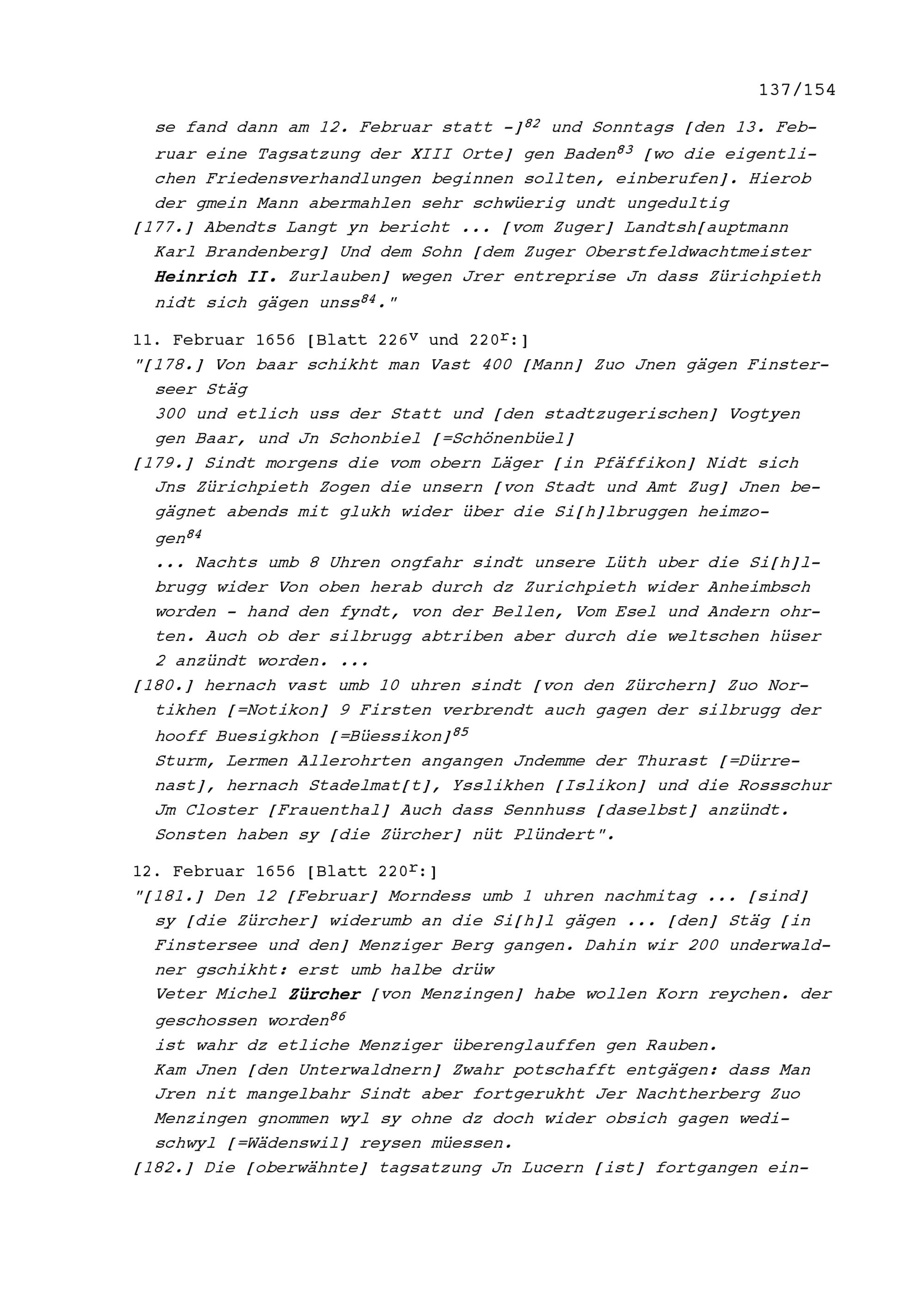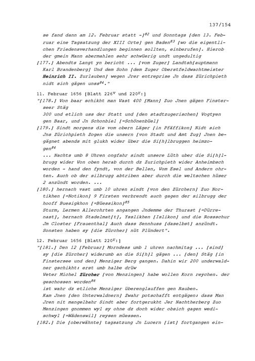 Notizen von Beat II. Zurlauben, Stadt- und Amtrat Zug und Kriegsrat, zum Artherhandel von 1655, zum Villmergerkrieg von 1656 sowie zu den Friedensverhandlungen