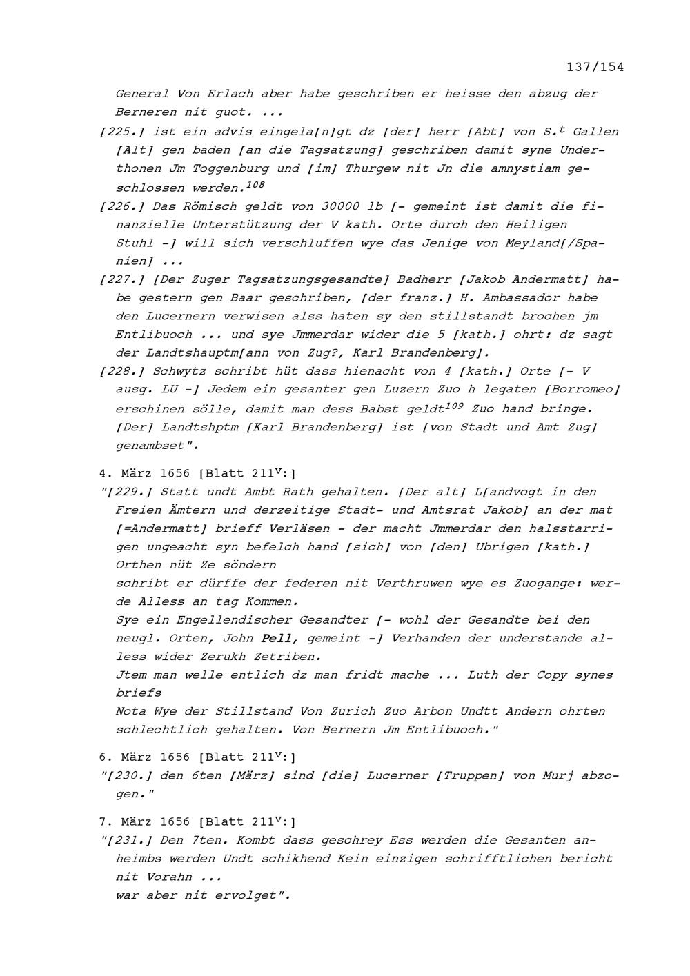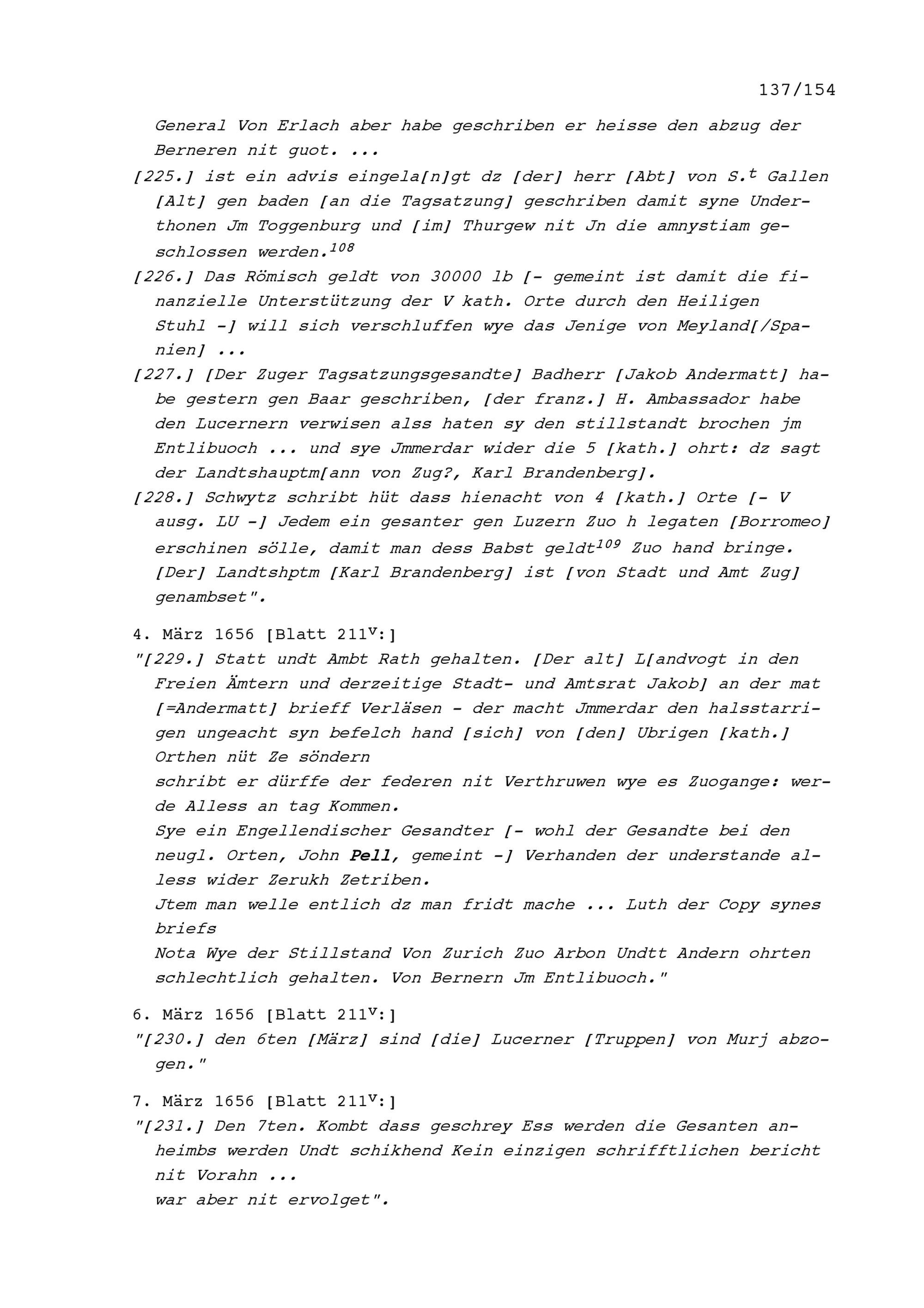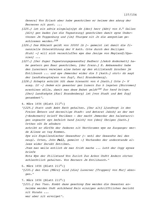 Notizen von Beat II. Zurlauben, Stadt- und Amtrat Zug und Kriegsrat, zum Artherhandel von 1655, zum Villmergerkrieg von 1656 sowie zu den Friedensverhandlungen