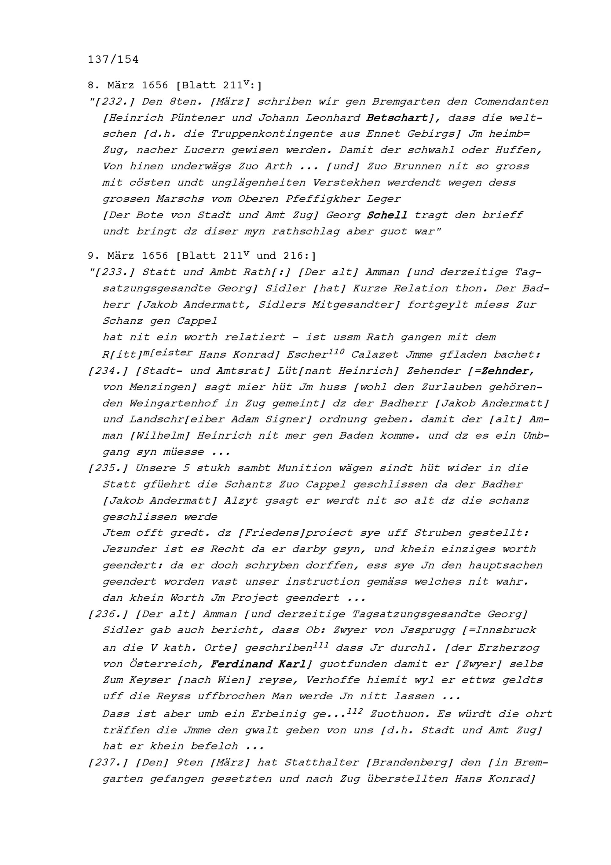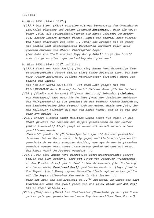 Notizen von Beat II. Zurlauben, Stadt- und Amtrat Zug und Kriegsrat, zum Artherhandel von 1655, zum Villmergerkrieg von 1656 sowie zu den Friedensverhandlungen
