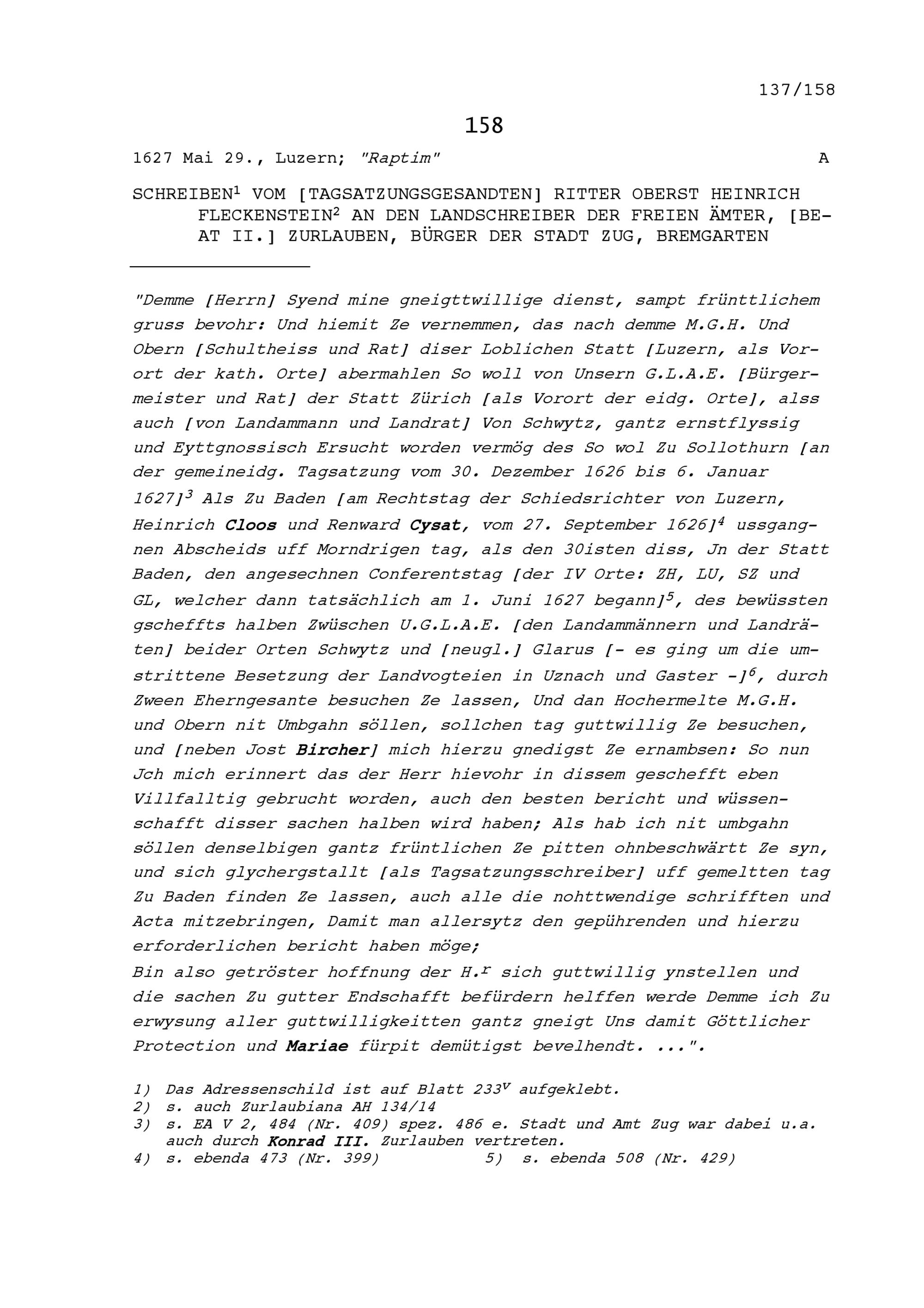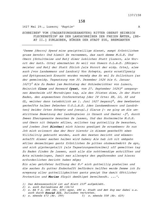 Schreiben von Heinrich Fleckenstein, Tagsatzungsgesandter und Oberst, an Beat II....