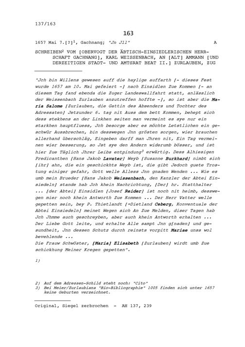 Schreiben von Karl Weissenbach, Obervogt der äbtisch-einsiedlerischen Herrschaft Gachnang, an Beat II. Zurlauben, Altammann und Stadt- und Amtrat, Zug