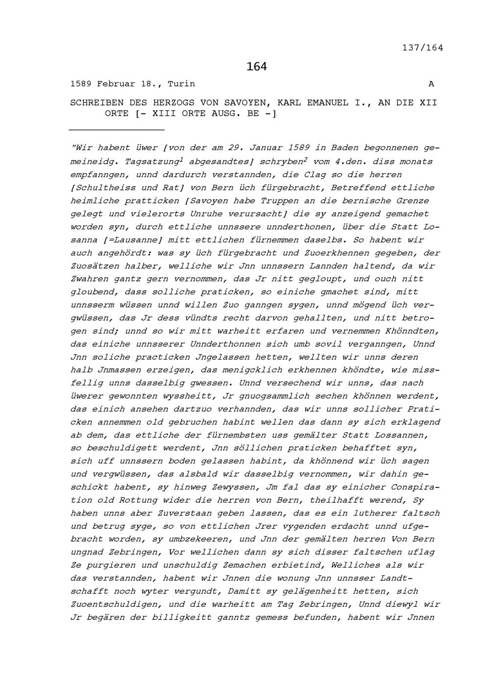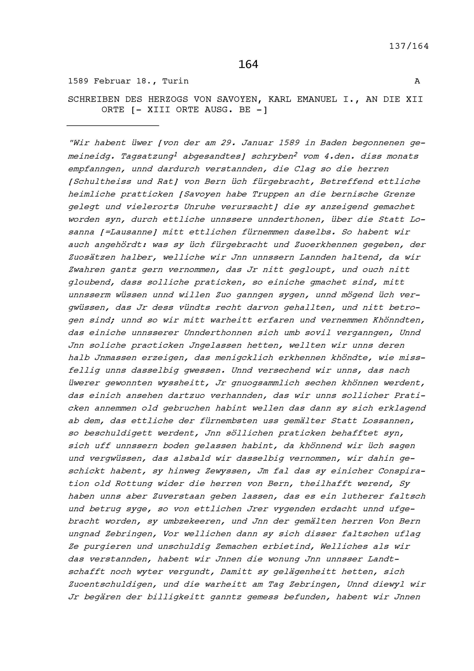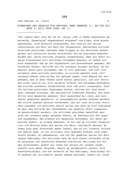 Schreiben von Karl Emanuel I., Herzog von Savoyen, an die Zwölf Orte