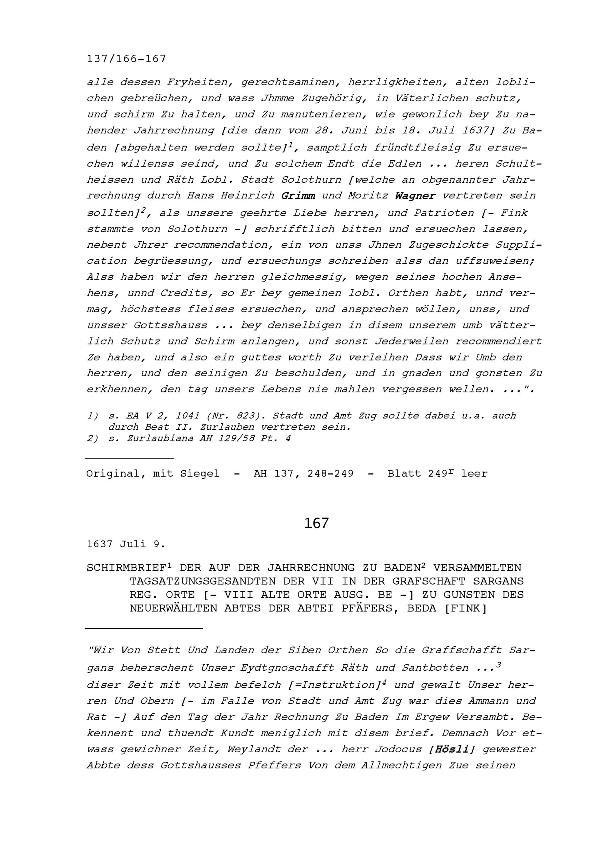 Schirmbrief der Tagsatzungsgesandten der Sieben in der Grafschaft Sargans regierenden Orte zu Gunsten Beda Fink, Abt der Abtei Pfäfers