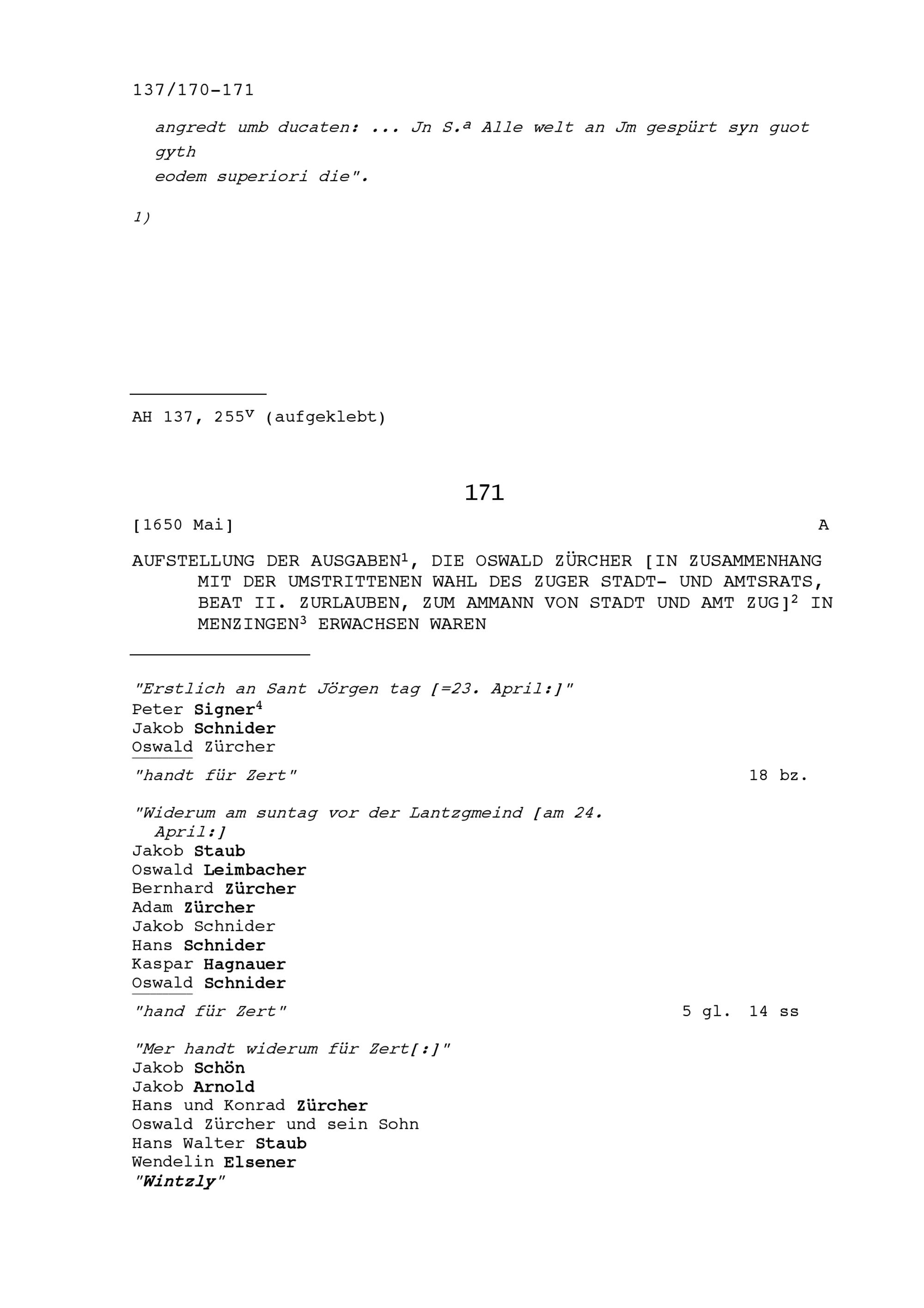 Ausgaben von Oswald Zürcher in Zusammenhang mit der umstrittenen Wahl von Beat II. Zurlauben, Stadt- und Amtrat Zug, zum Ammann von Stadt und Amt Zug in Menzingen