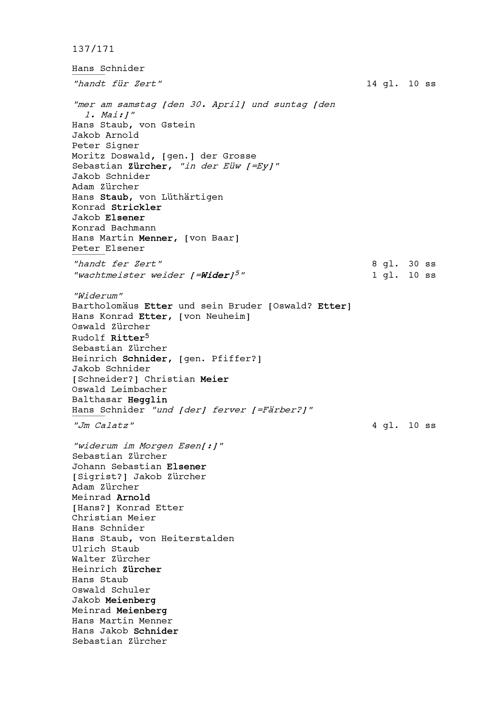 Ausgaben von Oswald Zürcher in Zusammenhang mit der umstrittenen Wahl von Beat II. Zurlauben, Stadt- und Amtrat Zug, zum Ammann von Stadt und Amt Zug in Menzingen