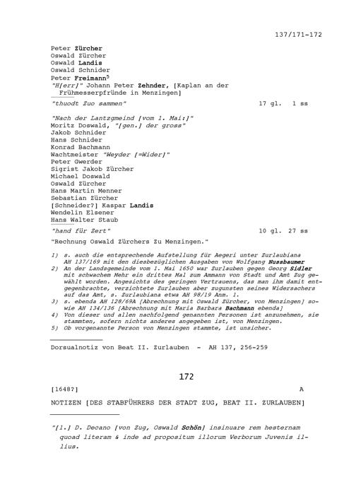 Notiz von Beat II. Zurlauben, Stabführer der Stadt Zug,