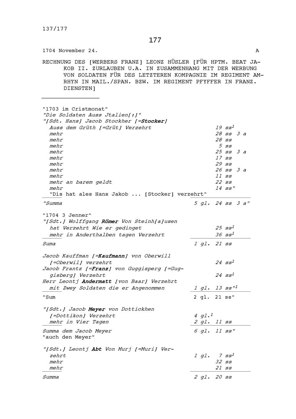 Rechnung von Franz Leonz Hüsler, Werber, für Beat Jakob II. Zurlauben, Hauptmann, unter anderem in Zusammenhang mit der Werbung von Soldaten für des letzteren Kompanie im Regiment Amrhyn in mailändisch-spanischen beziehungsweise im Regiment Pfyffer in französischen Diensten