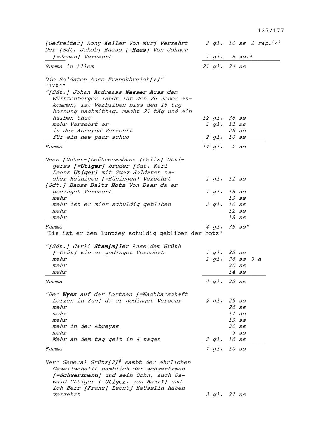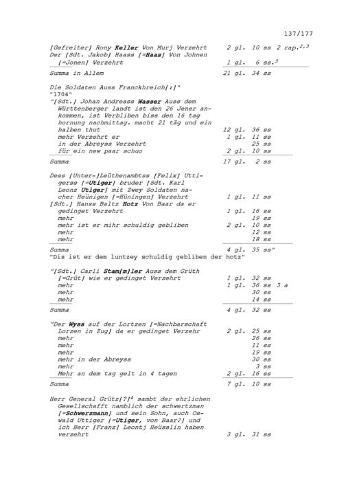 Rechnung von Franz Leonz Hüsler, Werber, für Beat Jakob II. Zurlauben, Hauptmann, unter anderem in Zusammenhang mit der Werbung von Soldaten für des letzteren Kompanie im Regiment Amrhyn in mailändisch-spanischen beziehungsweise im Regiment Pfyffer in französischen Diensten