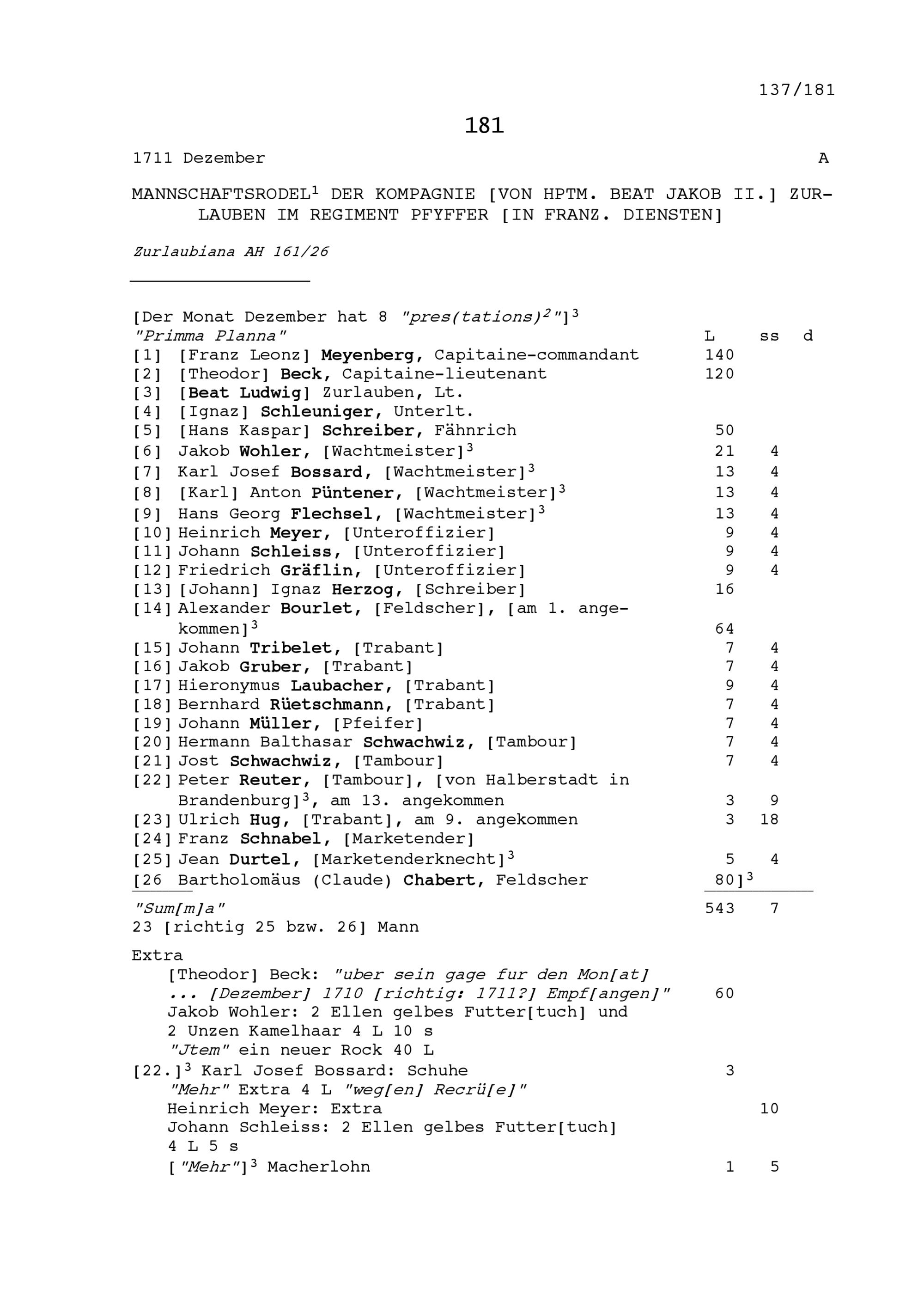 Mannschaftsrodel der Kompanie von Beat Jakob II. Zurlauben, Hauptmann im Regiment Pfyffer in französischen Diensten
