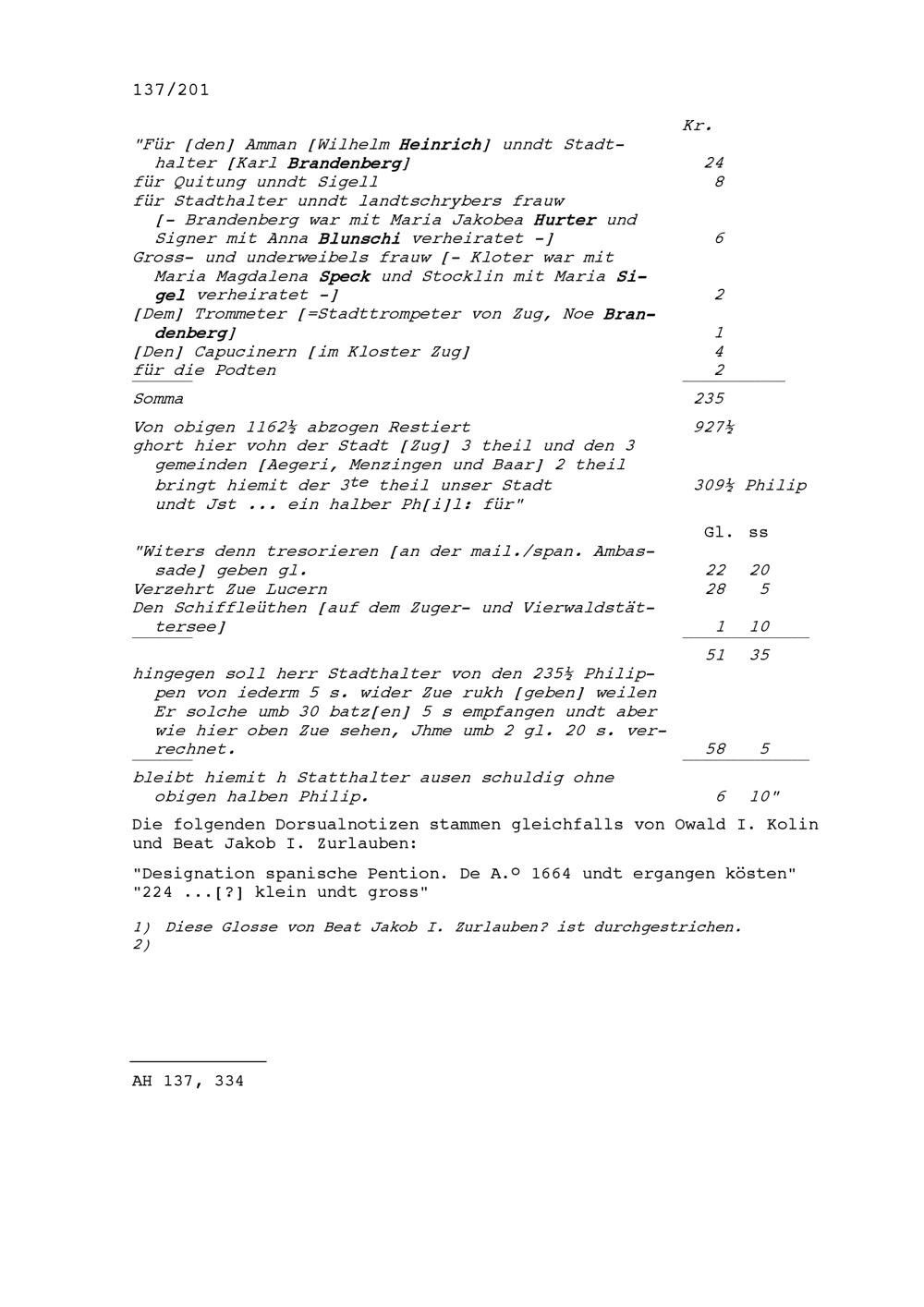 Abrechnung über die Austeilung der mailändisch-spanischen Pensionen in Stadt und Amt Zug, erstellt von Oswald I. Kolin, Stadt- und Amtsrat Zug, und von Beat Jakob I. Zurlauben, Stadt- und Amtsrat Zug