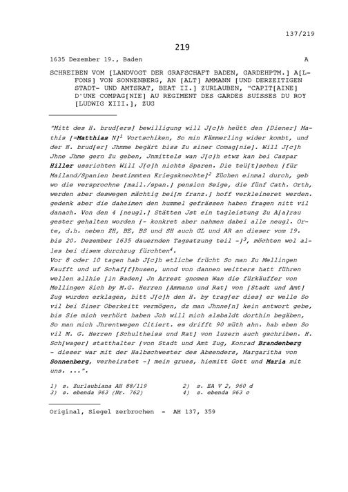 Schreiben von Alfons von Sonnenberg, Landvogt der Grafschaft Baden und Gardehauptmann, an Beat II. Zurlauben, Hauptmann, Altammann und Stadt- und Amtrat, Zug