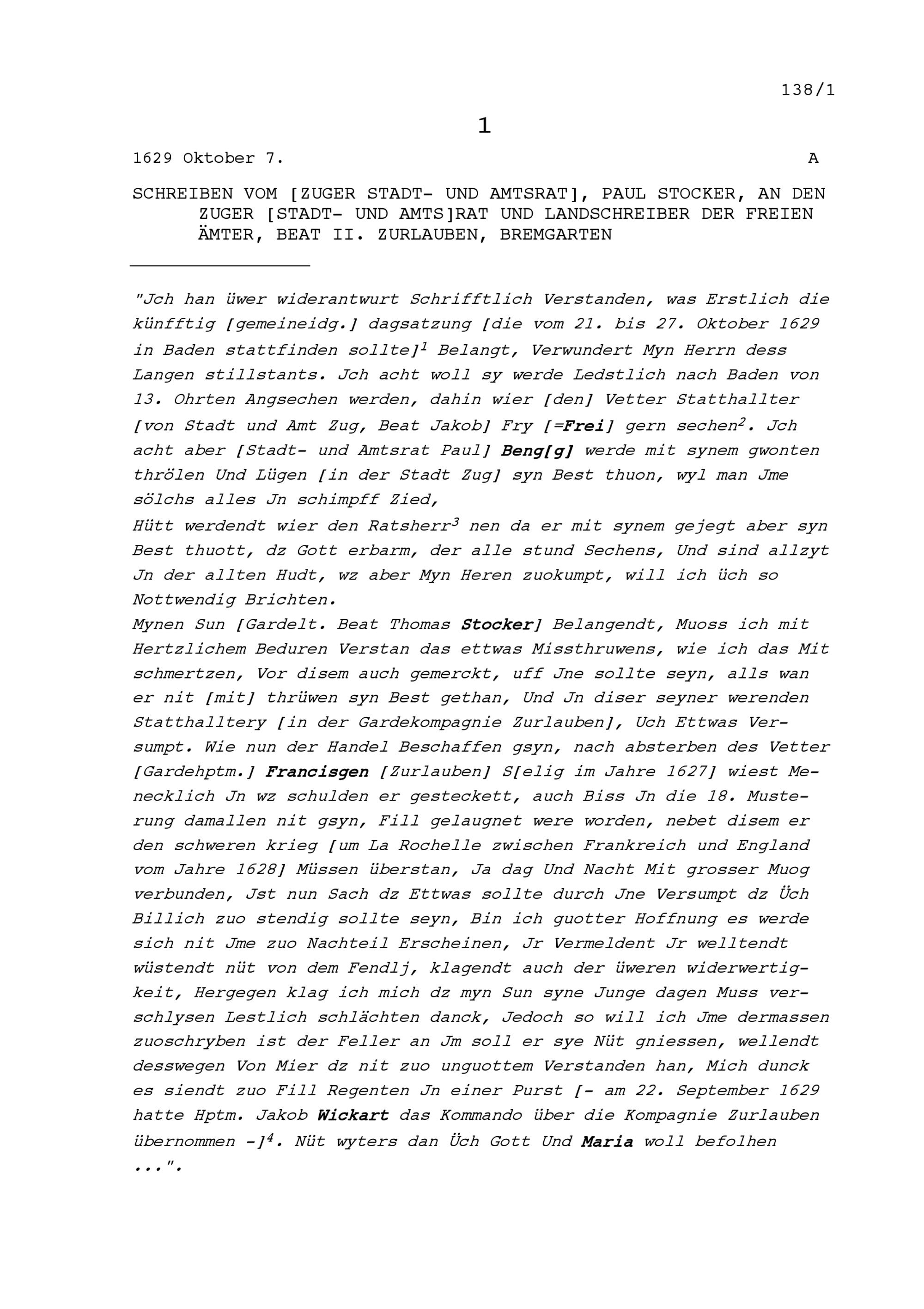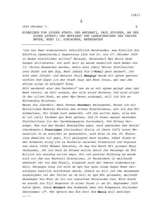 Schreiben von Paul Stocker, Stadt- und Amtrat Zug, an Beat II. Zurlauben, Stadt- und Amtrat Zug und Landschreiber der Freien Ämter, Bremgarten