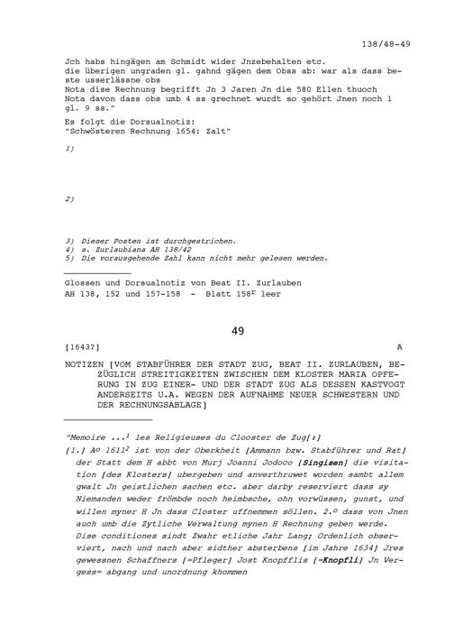 Notiz von Beat II. Zurlauben, Stabführer der Stadt Zug, bezüglich Streitigkeiten zwischen dem Kloster Maria Opferung in Zug einerseits und der Stadt Zug als dessen Kastvogt anderseits unter anderem wegen der Aufnahme neuer Klosterfrauen und der Rechnungsablage
