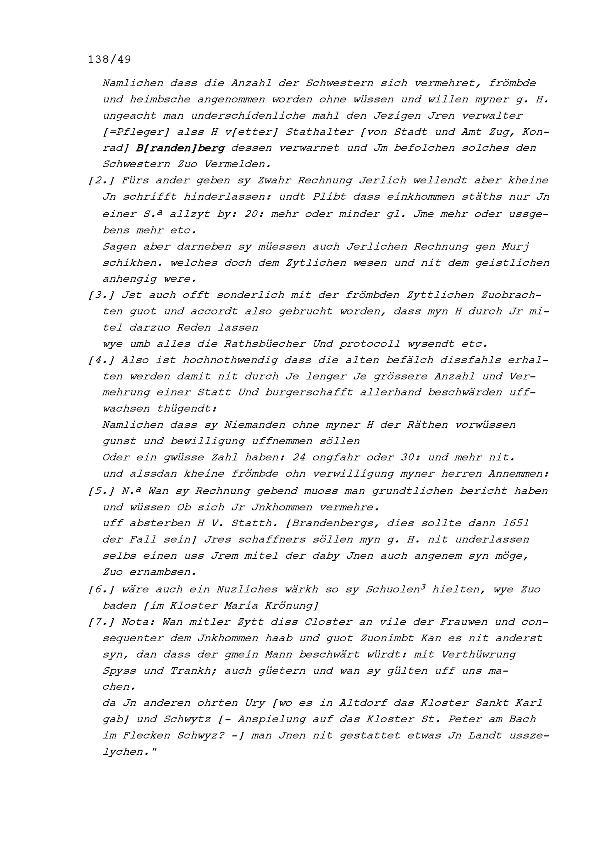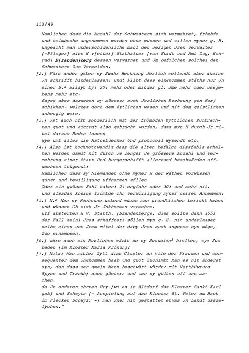 Notiz von Beat II. Zurlauben, Stabführer der Stadt Zug, bezüglich Streitigkeiten zwischen dem Kloster Maria Opferung in Zug einerseits und der Stadt Zug als dessen Kastvogt anderseits unter anderem wegen der Aufnahme neuer Klosterfrauen und der Rechnungsablage