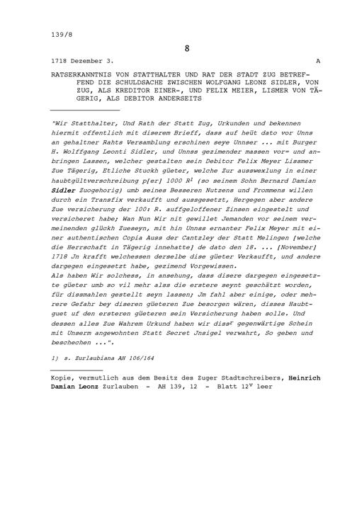 Ratsbeschluss des Statthalters und Rats der Stadt Zug betreffend die Schuldsache zwischen Wolfgang Leonz Sidler, von Zug, als Gläubiger einerseits, und Felix Meier, Lismer von Tägerig, als Schuldner anderseits