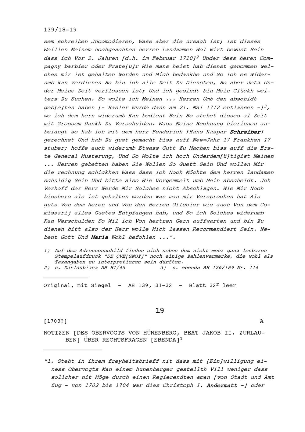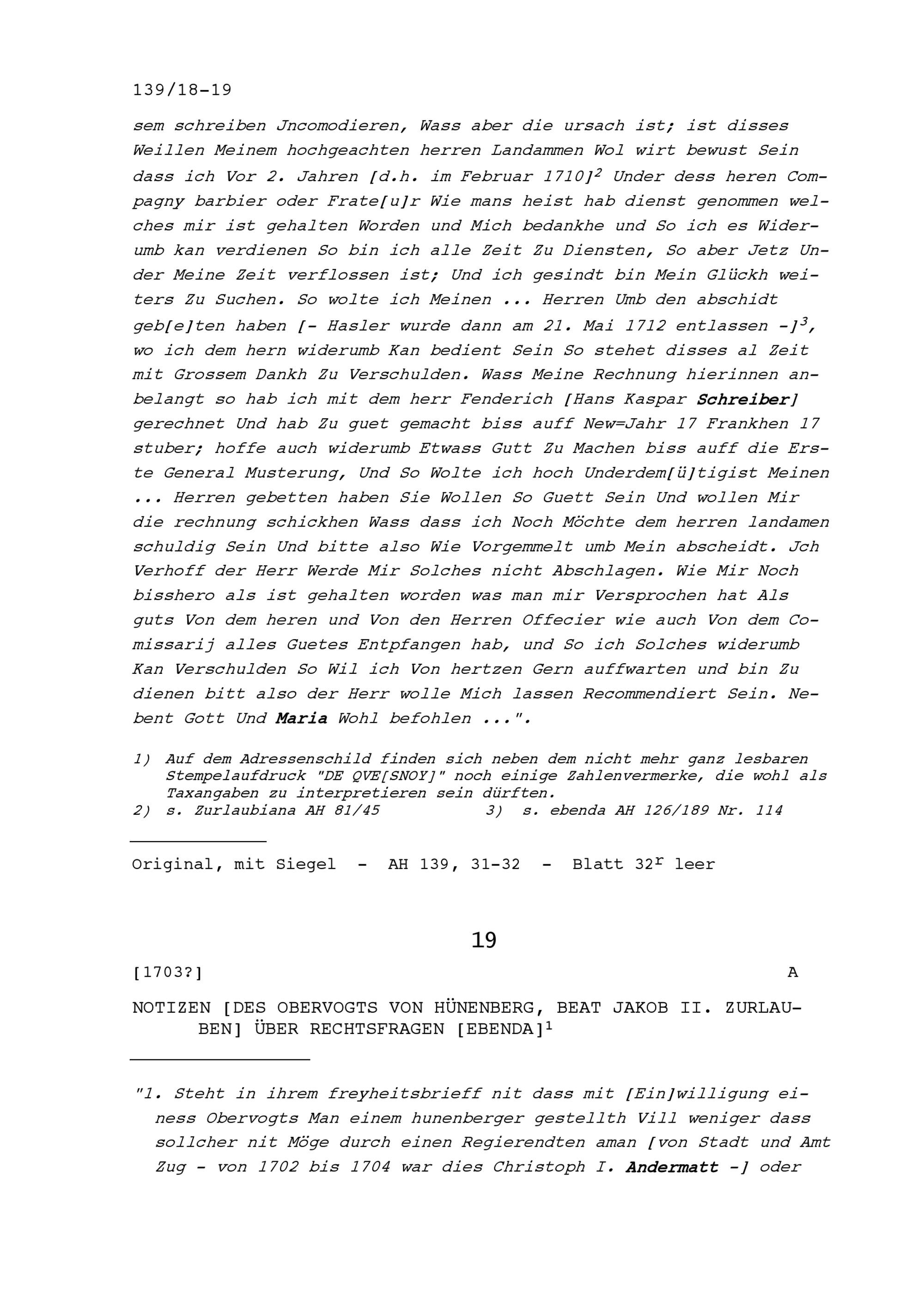 Notiz von Beat Jakob II. Zurlauben, Obervogt von Hünenberg, über Rechtsfragen