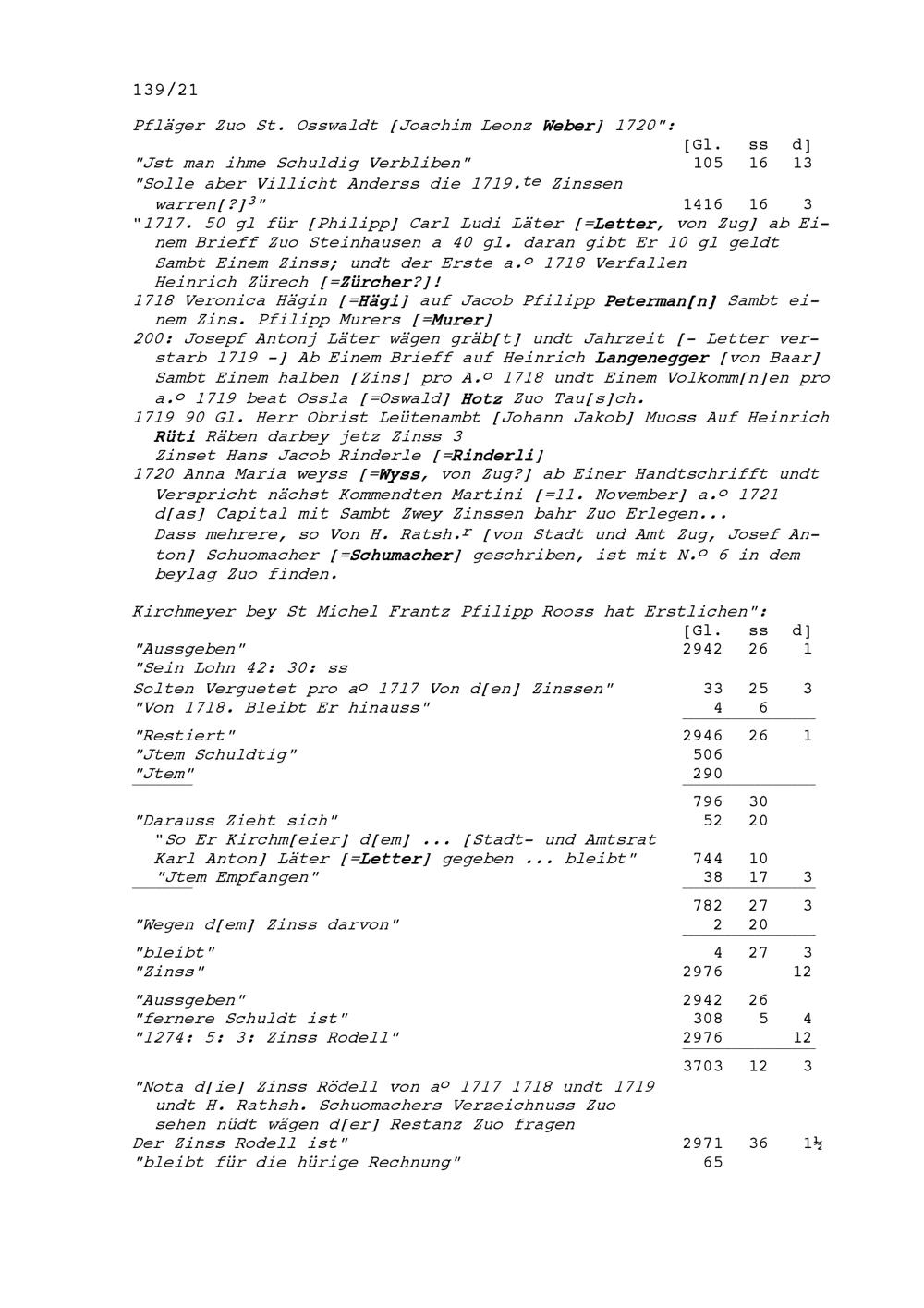 Jahrrechnung der Stadt Zug für das Jahr 1720