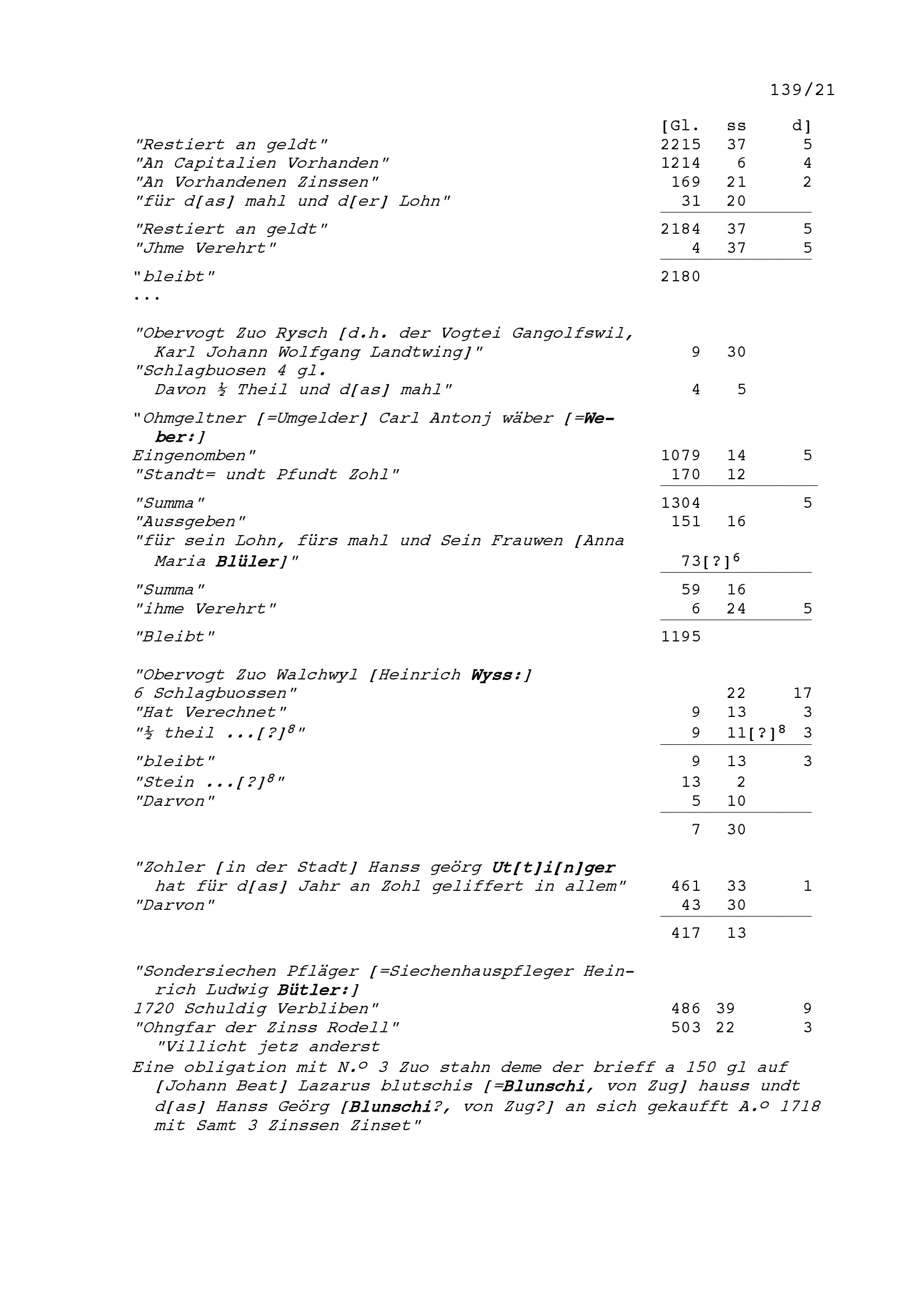 Jahrrechnung der Stadt Zug für das Jahr 1720 (Auszug)