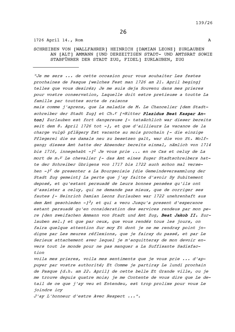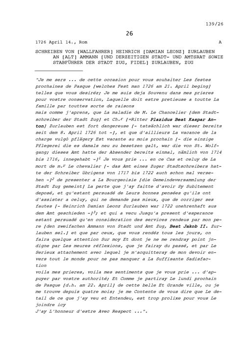 Schreiben von Heinrich Damian Leonz Zurlauben, Wallfahrer, an Fidel Zurlauben, Altammann...