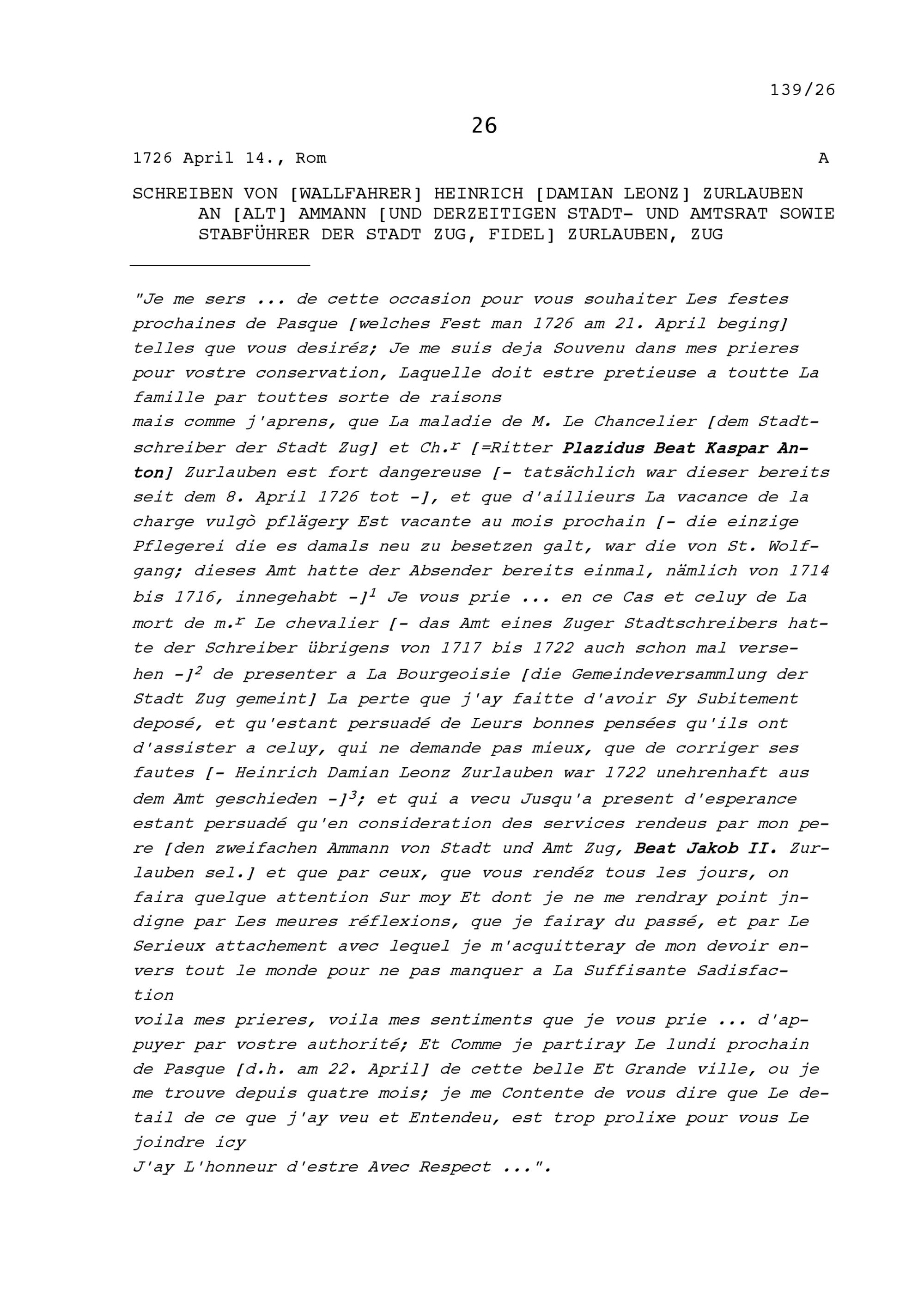 Schreiben von Heinrich Damian Leonz Zurlauben, Wallfahrer, an Fidel Zurlauben, Altammann und Stadt- und Amtrat sowie Stabführer der Stadt Zug, Zug