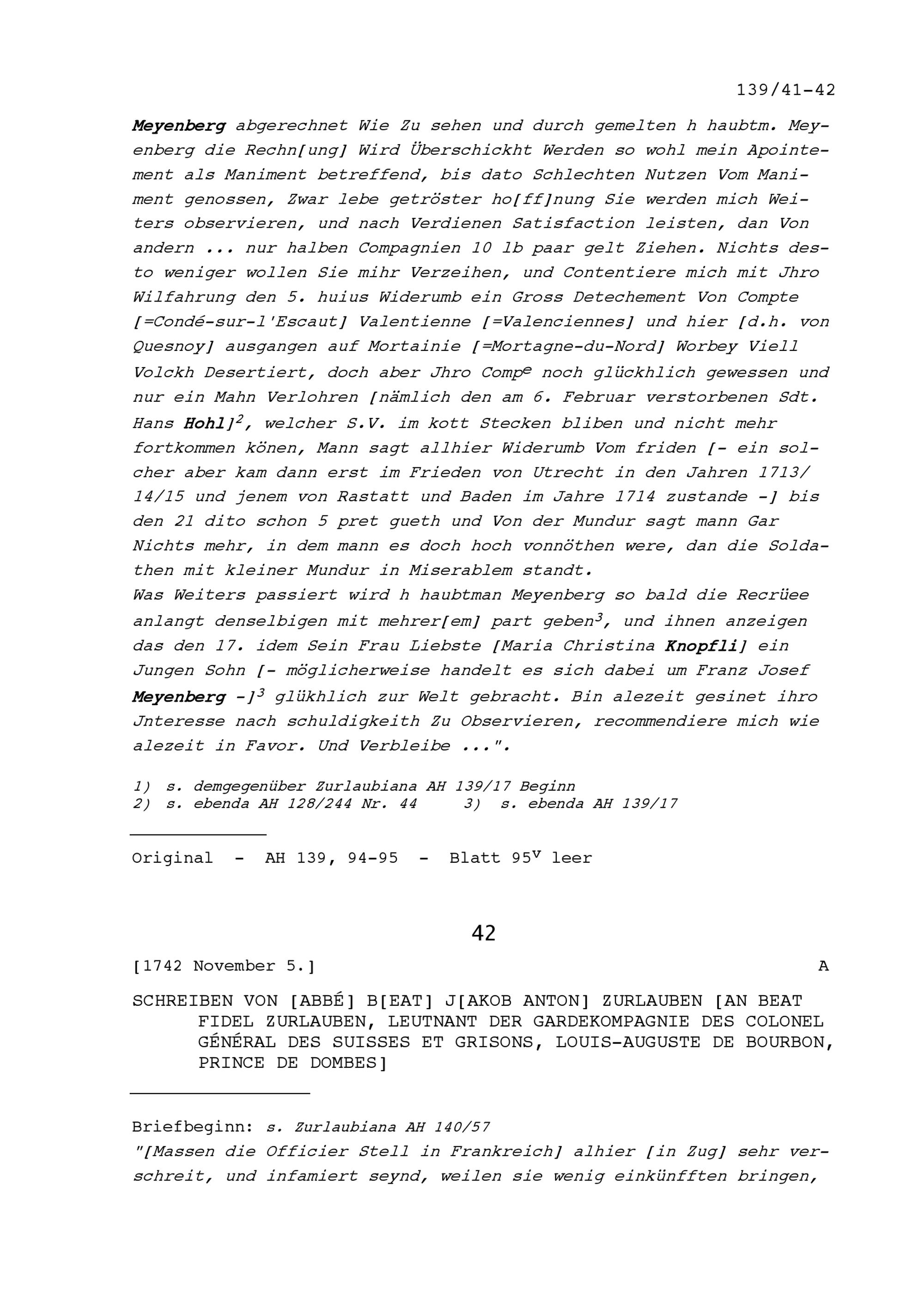 Schreiben von Beat Jakob Anton Zurlauben, Priester, an Beat Fidel Zurlauben, Leutnant der Gardekompanie von Louis-Auguste de Bourbon, Prince de Dombes, Generaloberst der Schweizer und Bündner