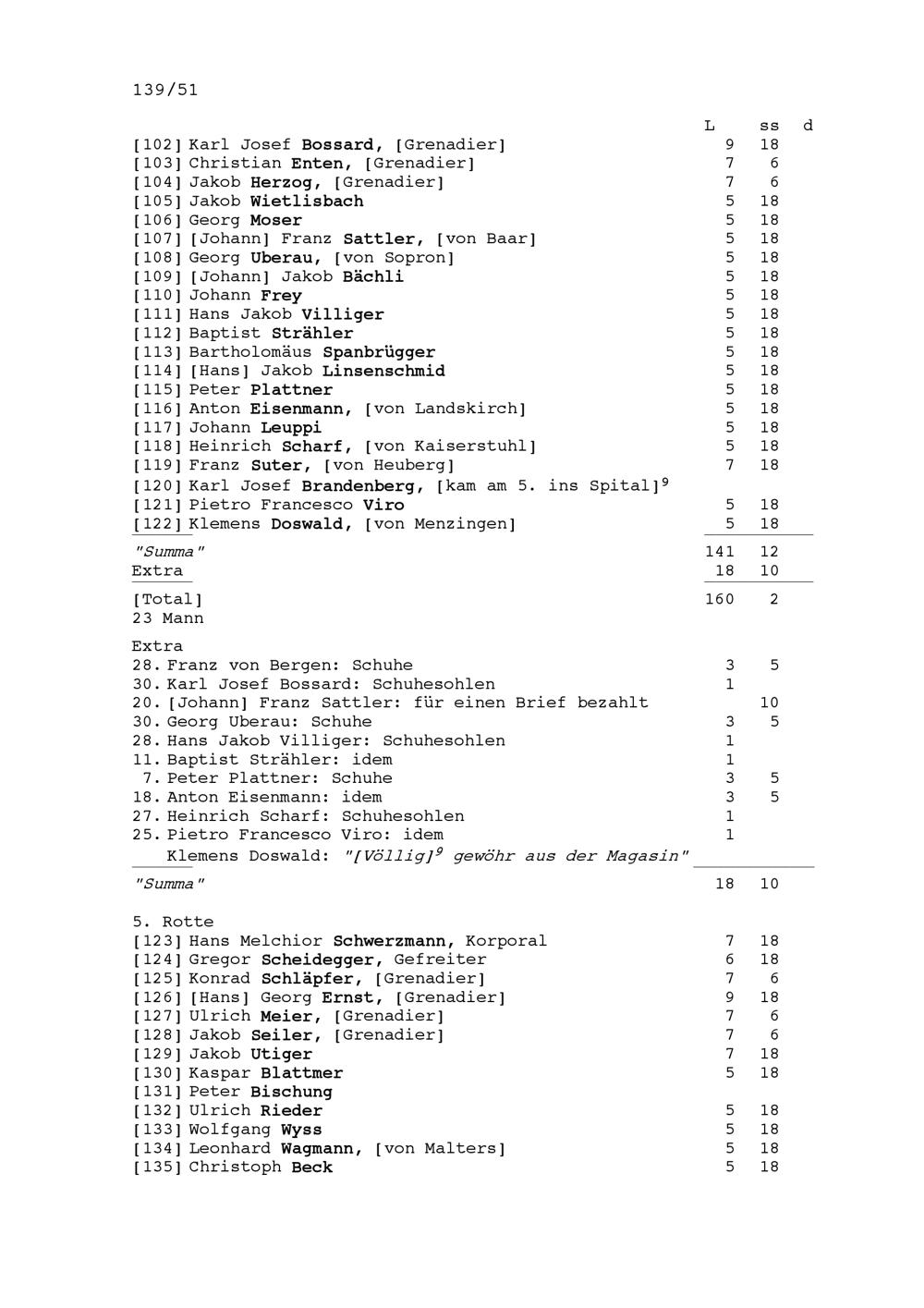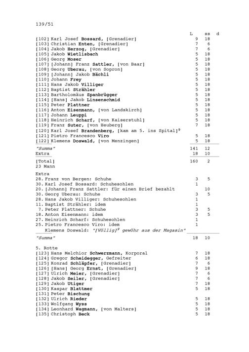 Mannschaftsrodel der Kompanie von Beat Jakob II. Zurlauben, Hauptmann im Regiment Pfyffer in französischen Diensten