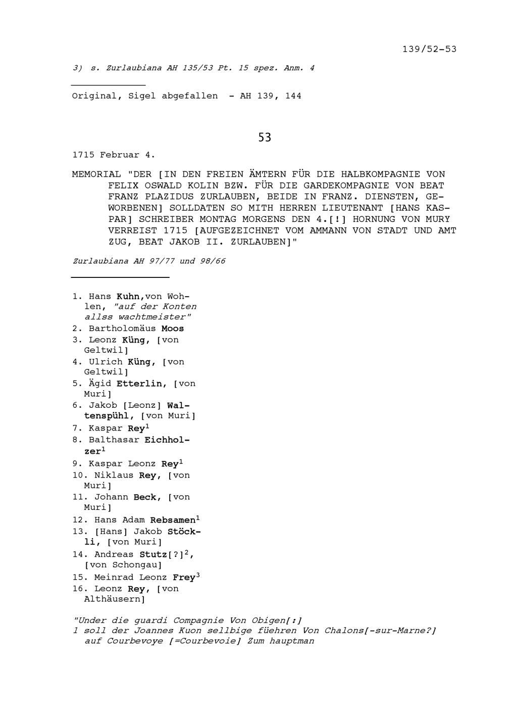 Bericht über die Soldaten, die mit Hans Kaspar Schreiber, Leutnant, am 4. Februar 1715 von Muri verreist 1715, geworbenen in den Freien Ämter für die Halbkompanie von Felix Oswald Kolin beziehungsweise für die Gardekompanie von Beat Franz Plazidus Zurlauben, beide in französischen Diensten, aufgezeichnet von Beat Jakob II. Zurlauben, Ammann von Stadt und Amt Zug