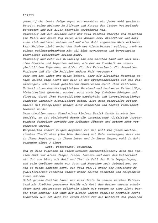 Rede von Heinrich Damian Leonz Zurlauben, Zuger Stadtschreiber, vor der Gemeindeversammlung der Stadt Zug