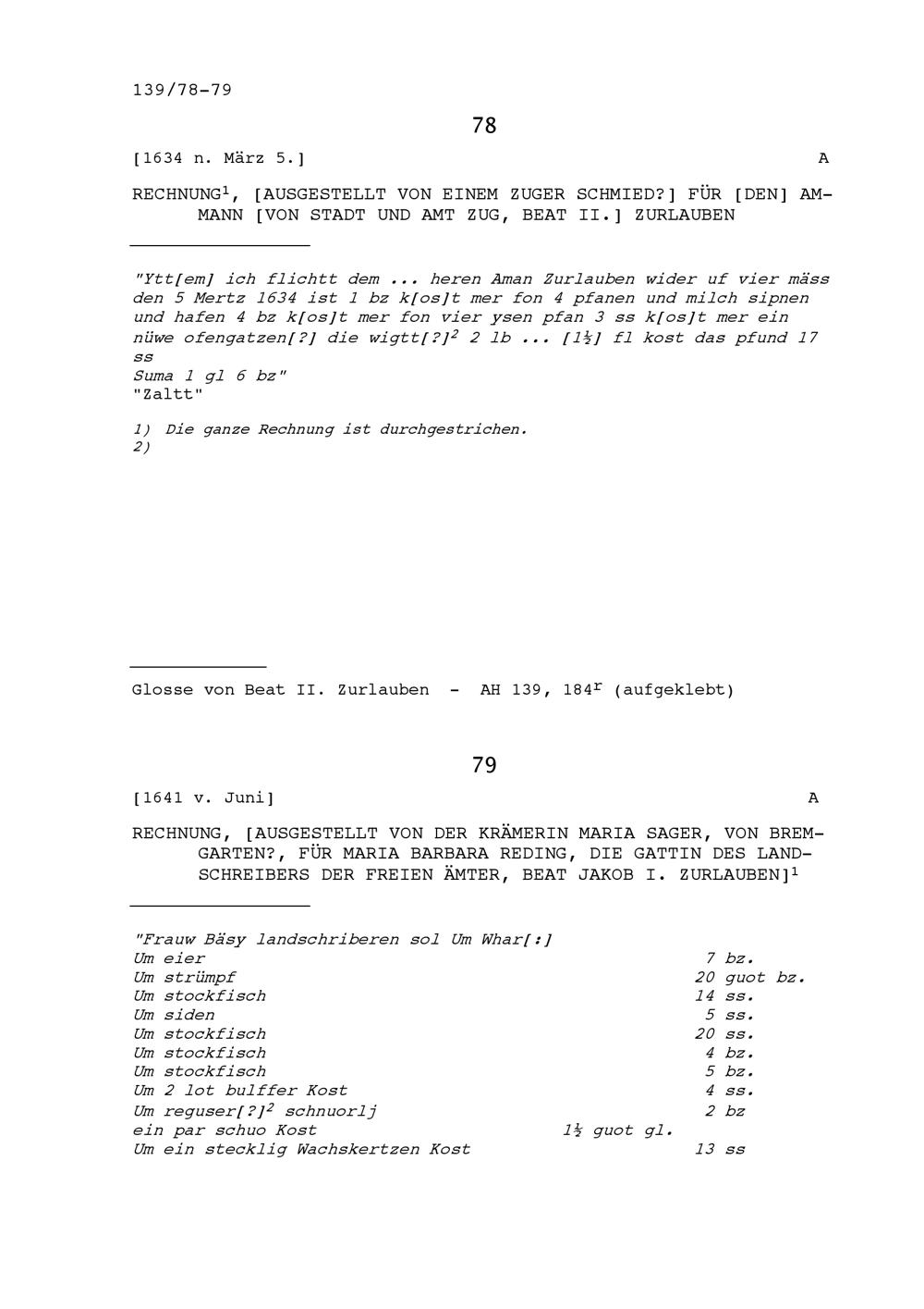 Rechnung für Beat II. Zurlauben, Ammann von Stadt und Amt Zug, ausgestellt von einem...