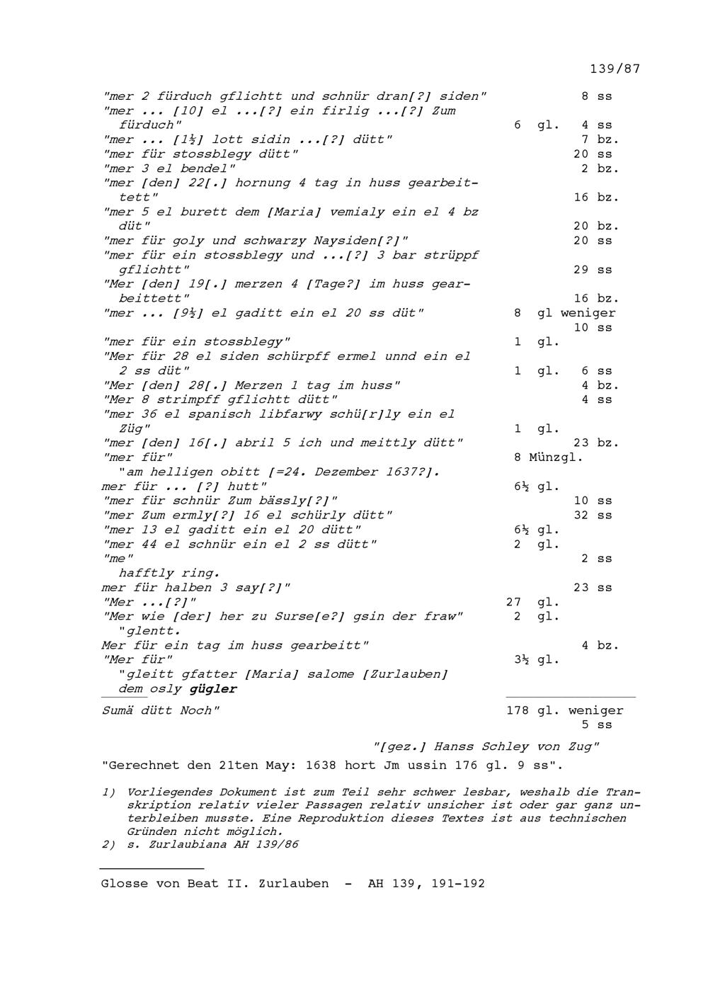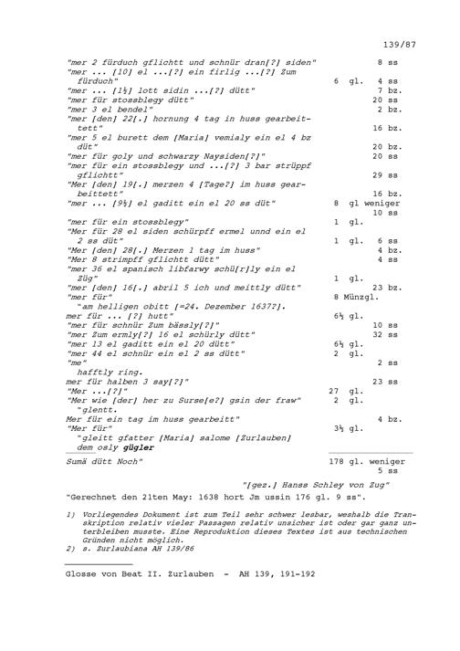 Rechnung für Beat II. Zurlauben, Altammann und Stadt- und Amtrat Zug, ausgestellt von Hans Schley, genannt Buck, Zuger Schneider und Tuchhändler